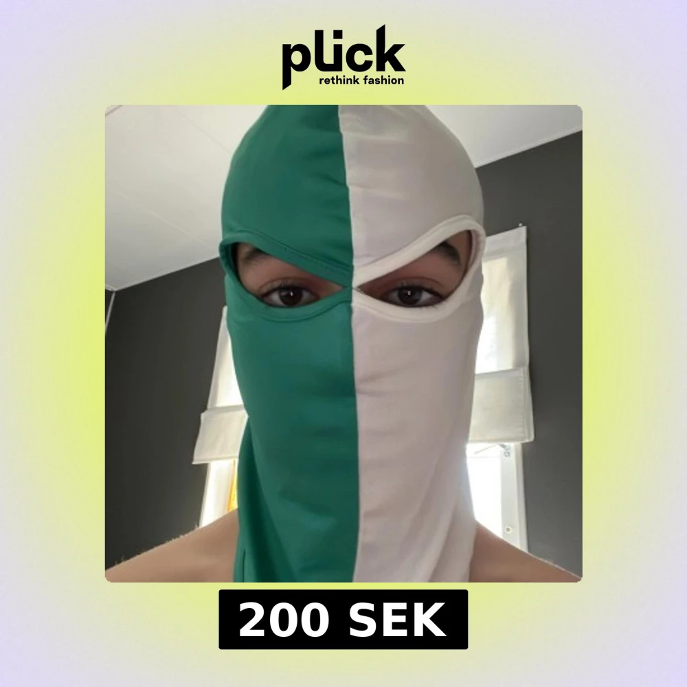 Säljer en tvåfärgad balaclava i grönt och vitt. Huvudbonaden täcker hela ansiktet förutom ögonen och är sydd i ett mjukt, stretchigt material. Perfekt för kalla dagar eller som statement-piece.