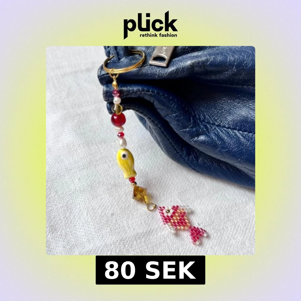 Unik bagcharm med mixade pärlor i olika färger och former, dekorerat med en handgjord fiskberlock av små pärlor. Handgjord av mig! ✨