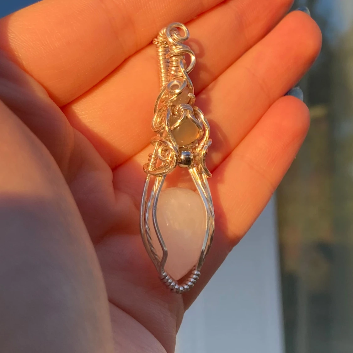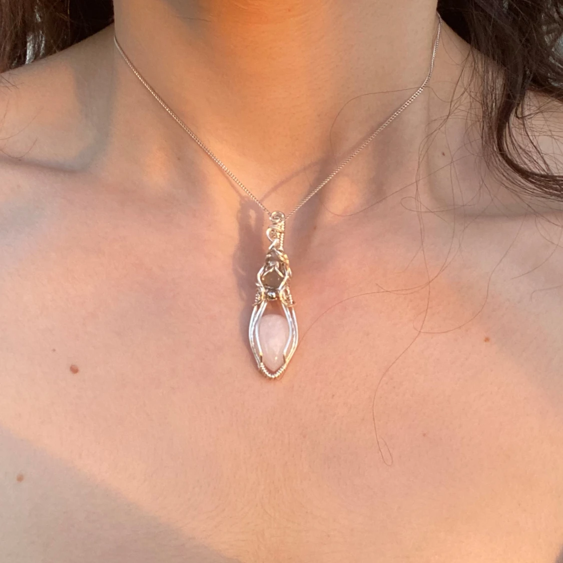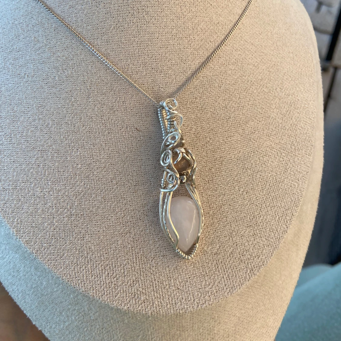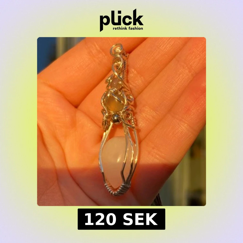 Unikt halsband med en vacker vit sten infattad i konstnärligt virad silvertråd. Hängsmycket har en elegant och organisk form, och kedjan är tunn och stilren. Perfekt för dig som gillar personliga smycken med boho-känsla.