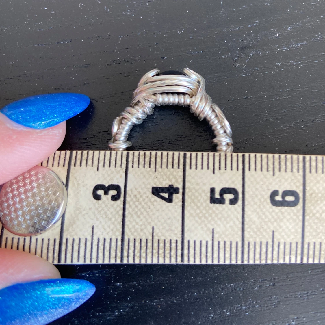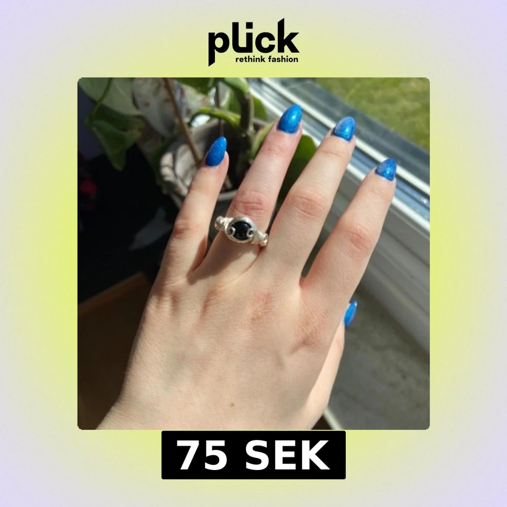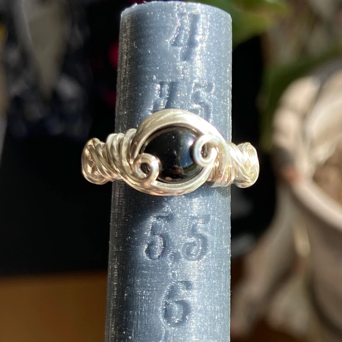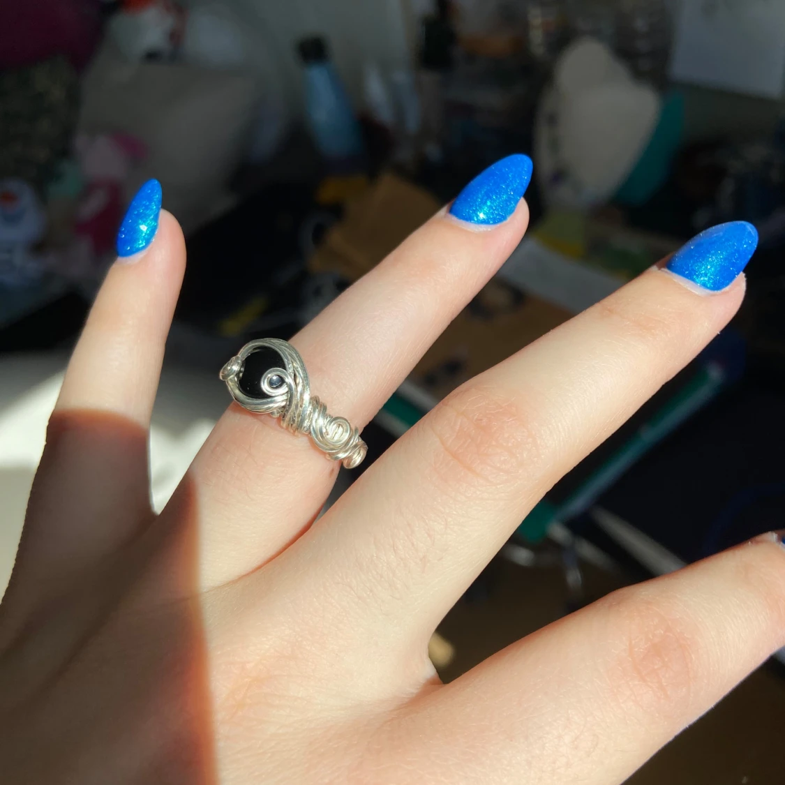 Unik handgjord ring i silverfärgad metall med en svart rund sten i mitten. Ringen har vackra snirkliga detaljer runt stenen och är i storlek ca 15 mm i diameter. Pågrund av de virade trådarna är ringen mer som en storlek 4,75 än en 5. Den är alltså lite mindre än en storlek 5. Perfekt för dig som gillar personliga smycken med lite mystisk känsla.