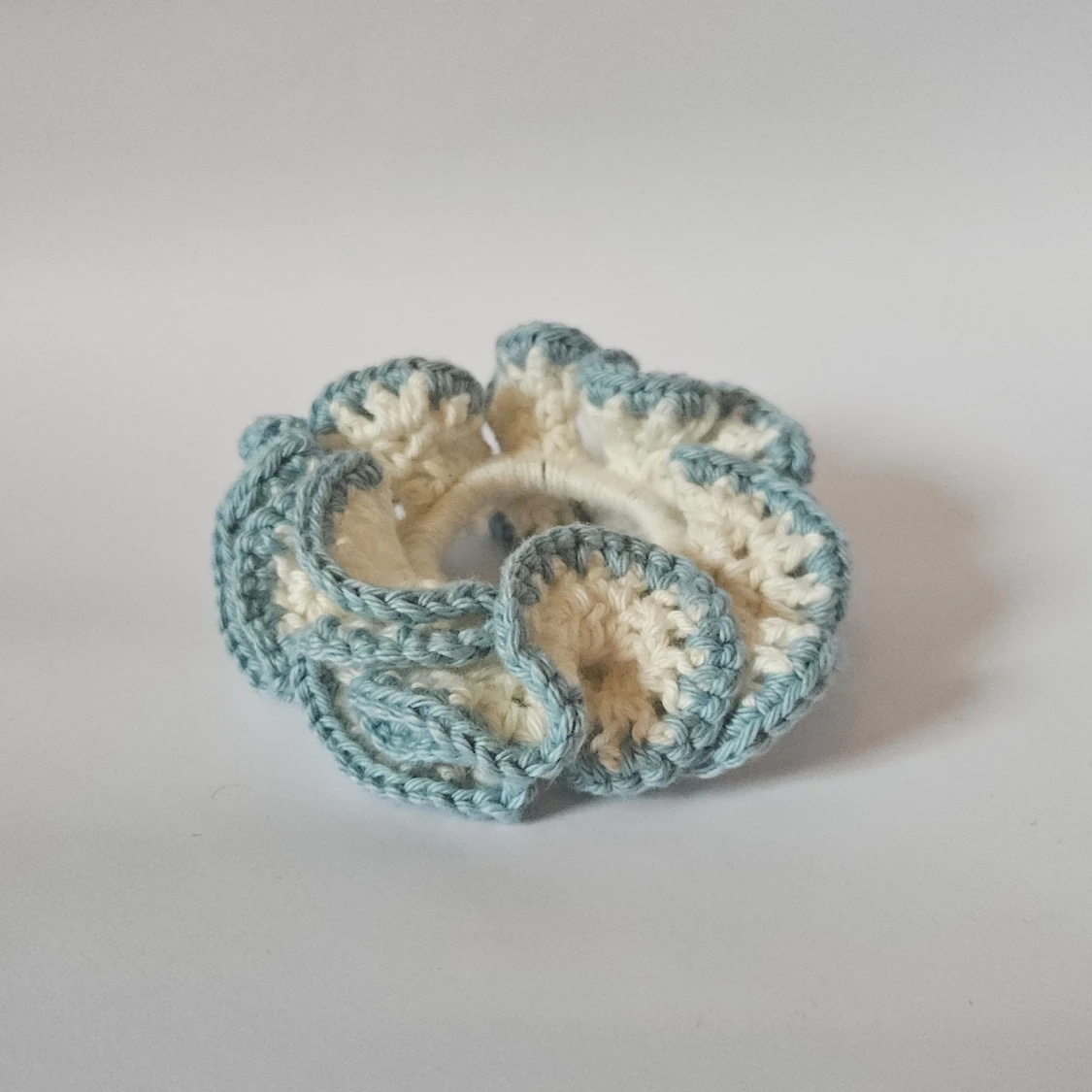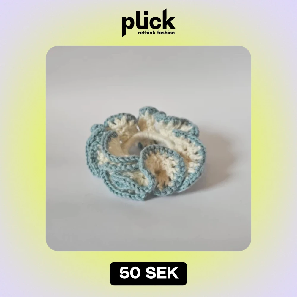 Superfin handgjord scrunchie som är virkad i en härlig kombination av blått och vitt. Perfekt för att ge din frisyr en söt och unik touch. Den är elastisk och passar de flesta hårtyper. Perfekt accessoar för både vardag och fest!