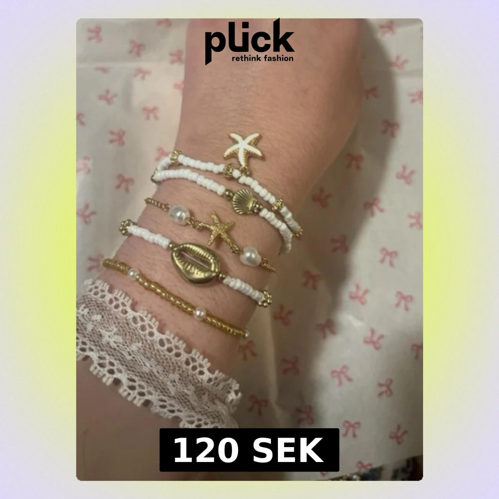 Armband med vita och guldfärgade pärlor, dekorerad med snäckor, sjöstjärnor och små gulddetaljer.