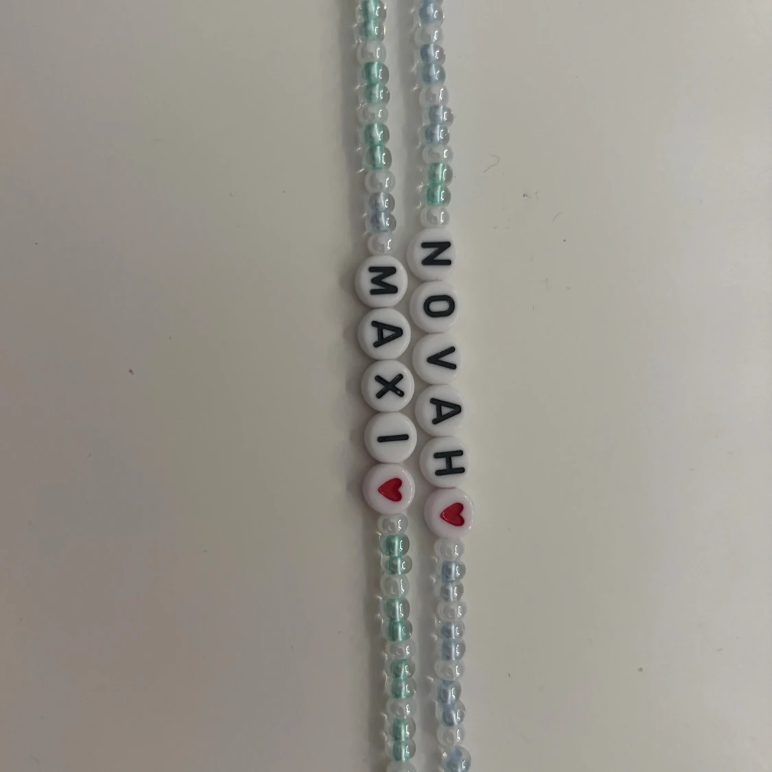 Två stycken egen designade armband med namn! Innan namnet finns 2st pärlor av den andras färg för att de ska bli mer lika varandra:)❤️Namn och färg går att ändra efter önskemål! Även mönstret på hur pärlorna blir går att ändra! Dessa kostar 40kr st❤️ armband görs efter önskemål:)