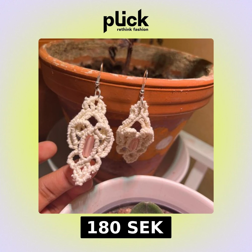 Unika örhängen i handknuten makramé med en ljusrosa pärla i mitten. De är gjorda i vit tråd och har en snygg, bohemisk form som verkligen sticker ut. Perfekta för dig som gillar personliga accessoarer.