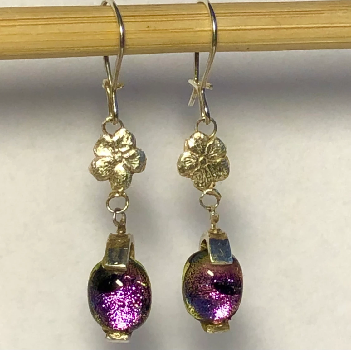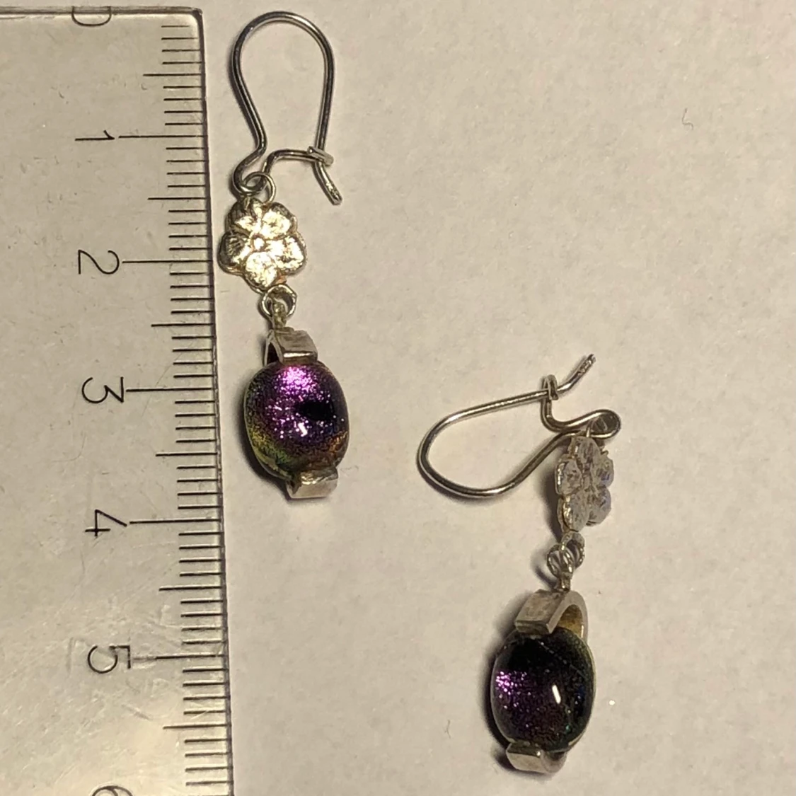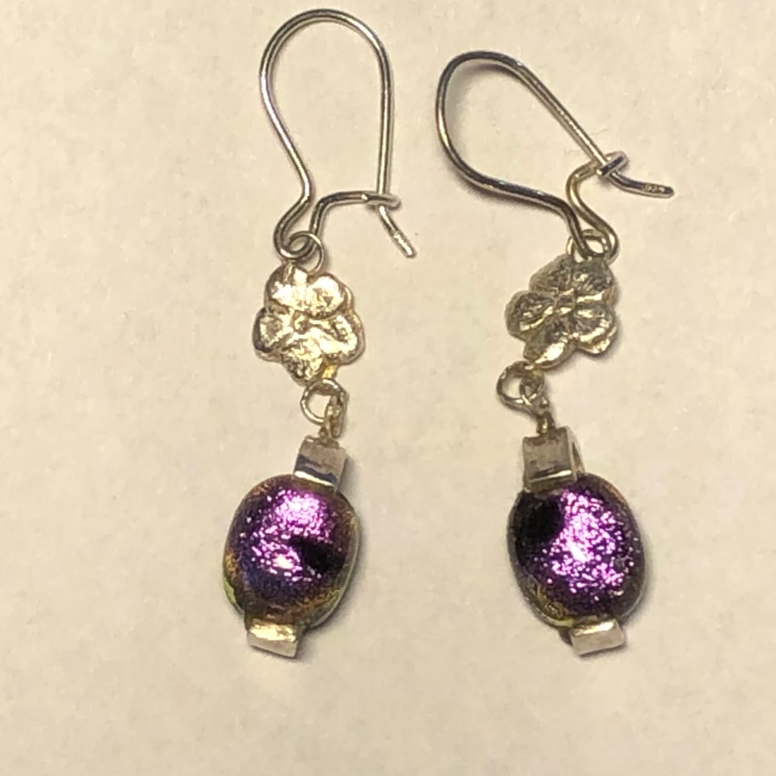 Handgjorda örhängen med blommor i silver och rosa glas med en liten svart fläck. Unika. Örkrokar som går att stänga.