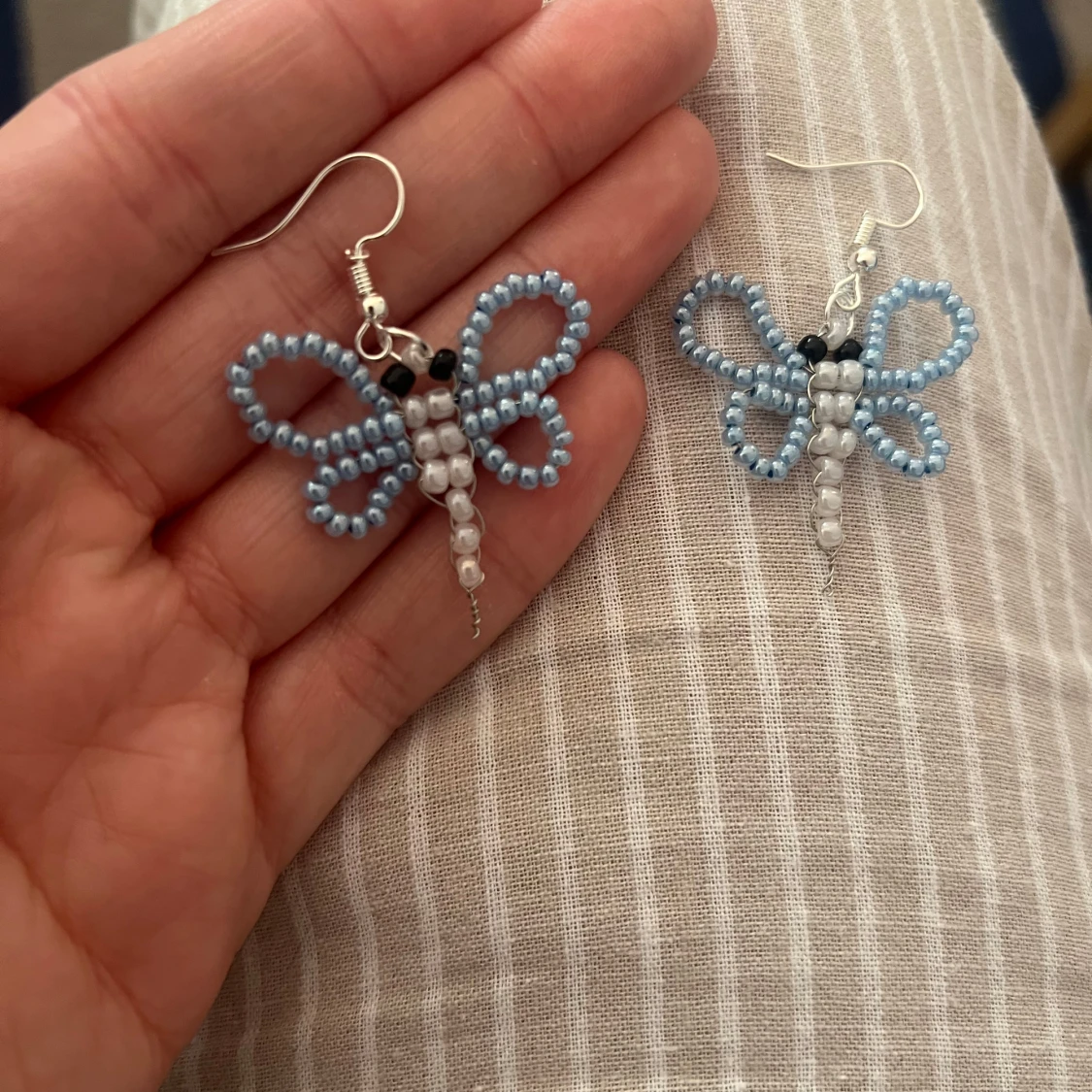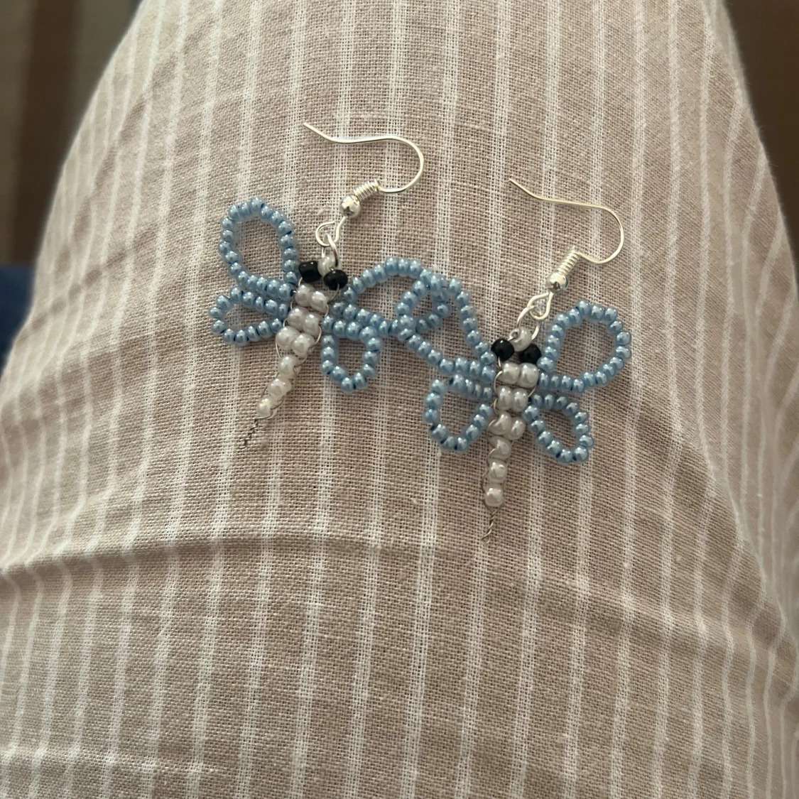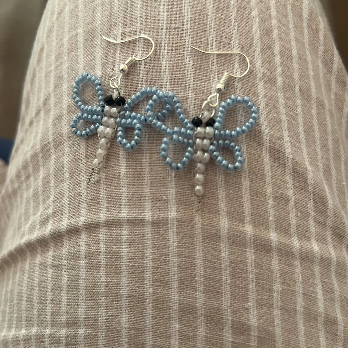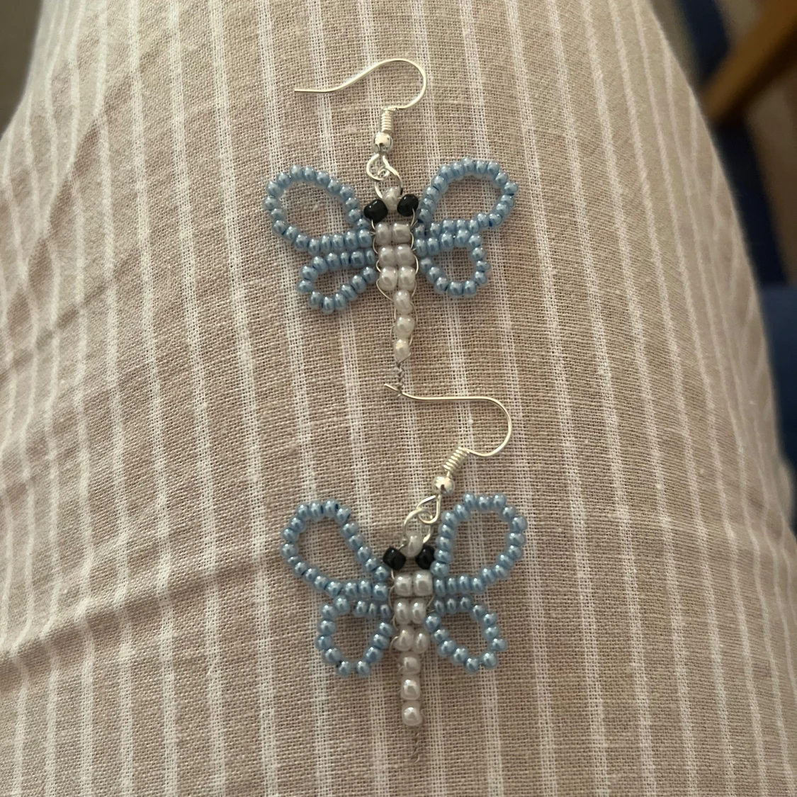 Superfina handgjorda örhängen formade som trollsländor med rosa pärlor! Vid frågor är det bara att skriva!
