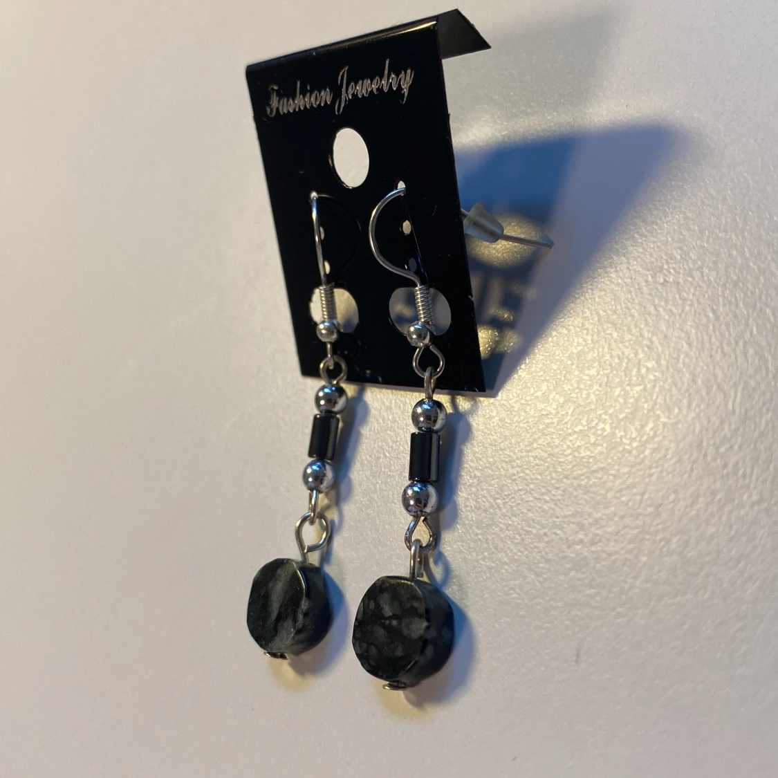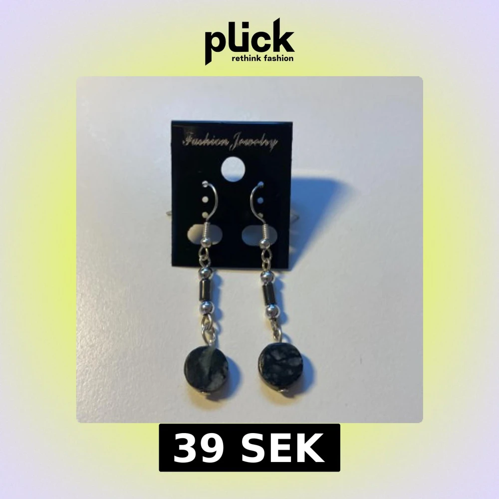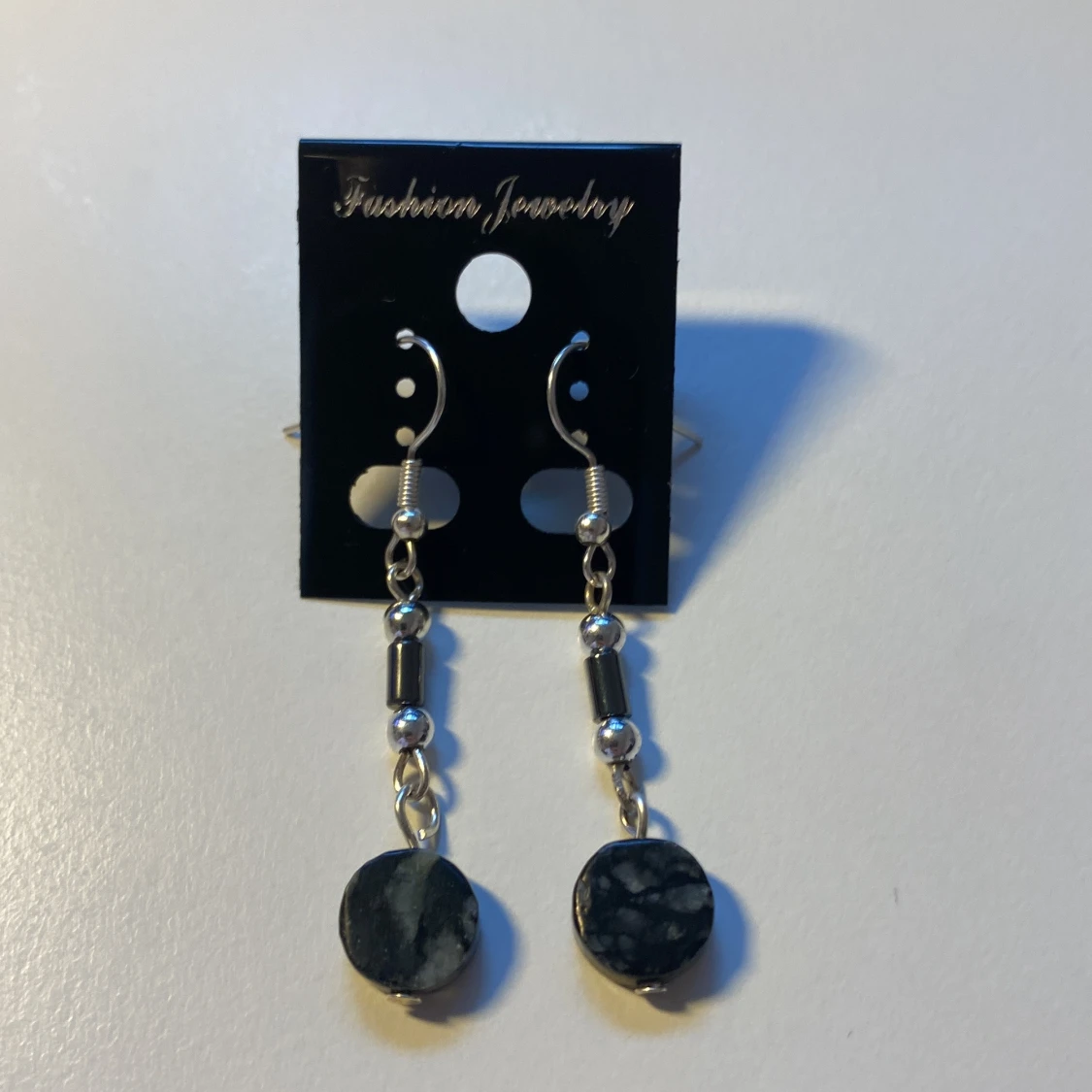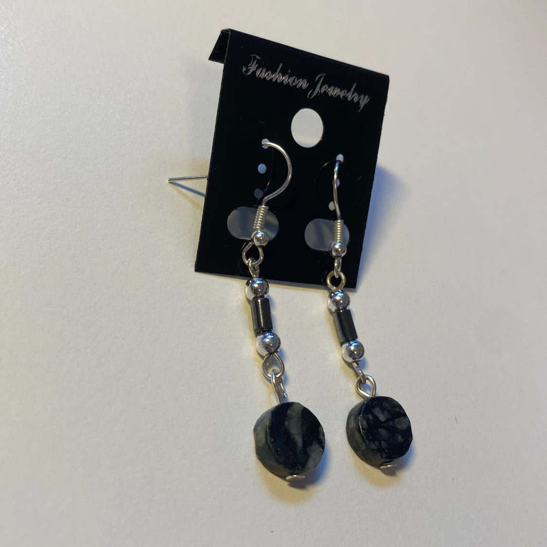 Snygga hängande örhängen med svarta, marmorerade stenar och silverfärgade detaljer. Örhängena har runda pärlor och cylinderformade metallpärlor som ger en cool och stilren vibe. Perfekta för att lyfta din look med en touch av mystik.
