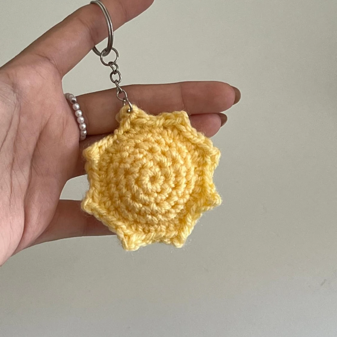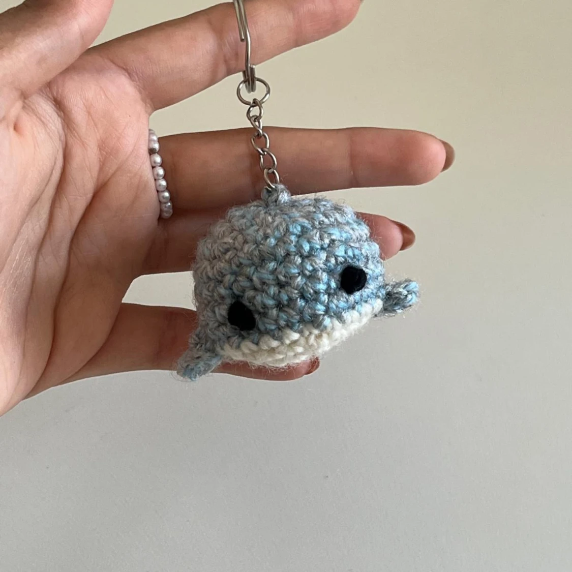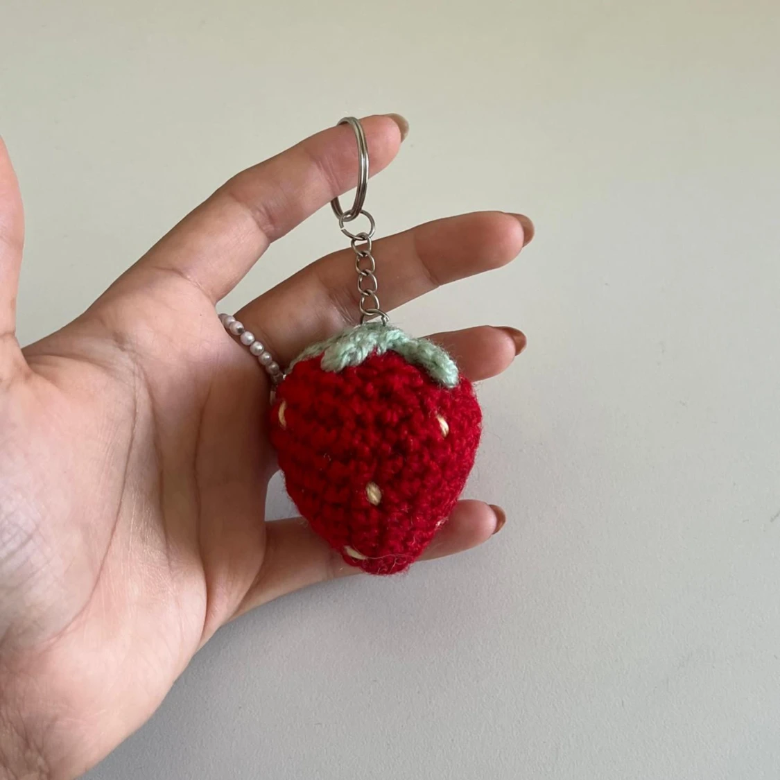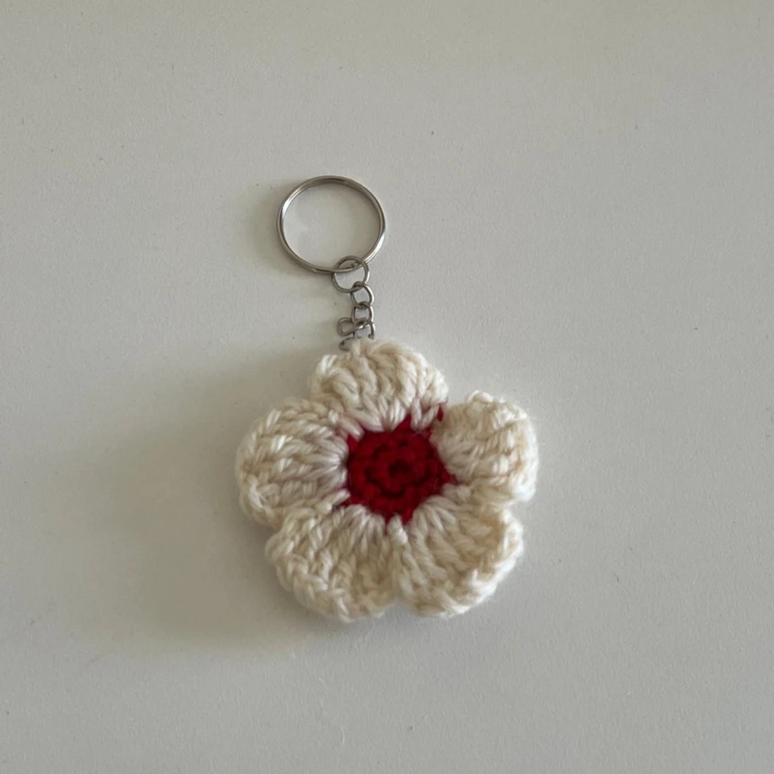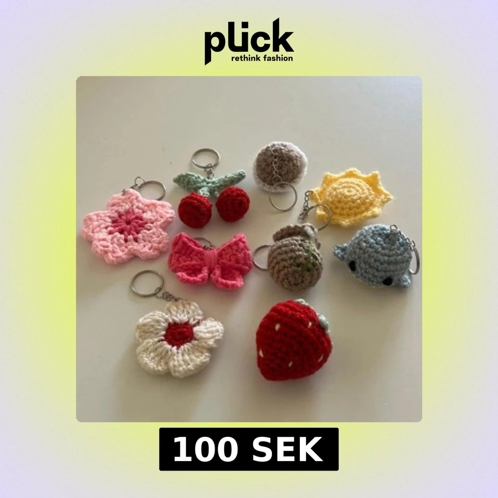 Unika handgjorda virkade nyckelringar i olika former och färger. Inkluderar en röd jordgubbe, en vit blomma med röd mitt och en blå val. Perfekta som personliga accessoarer eller presenter.