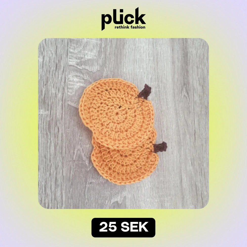 Säljer ett par supergulliga handgjorda virkade underlägg formade som pumpor. De är i en härlig orange färg med en liten brun stjälk. Bomullsgarn, perfekta nu till höst 🍂 (exempelbild med egna underlägg)