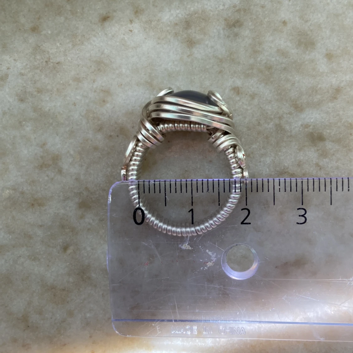 Unik handgjord ring i silverfärgad metall med en rund, grå agat i mitten. Ringen har snygga snirkliga detaljer runt stenen som ger en cool och bohemisk vibe. Perfekt statement-piece för dig som gillar personliga smycken. Storleksguide på sista bilden.
