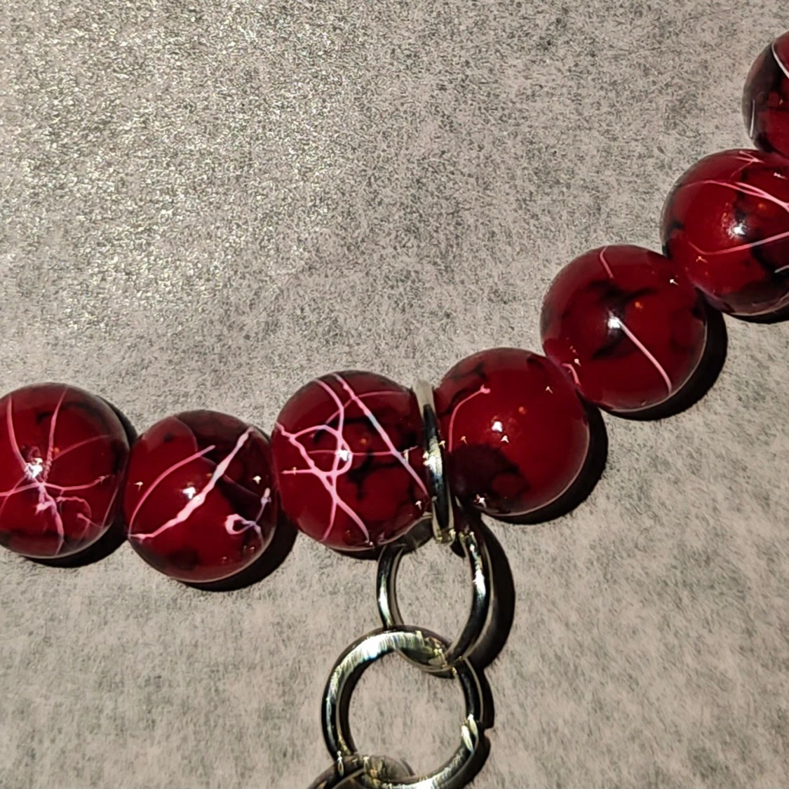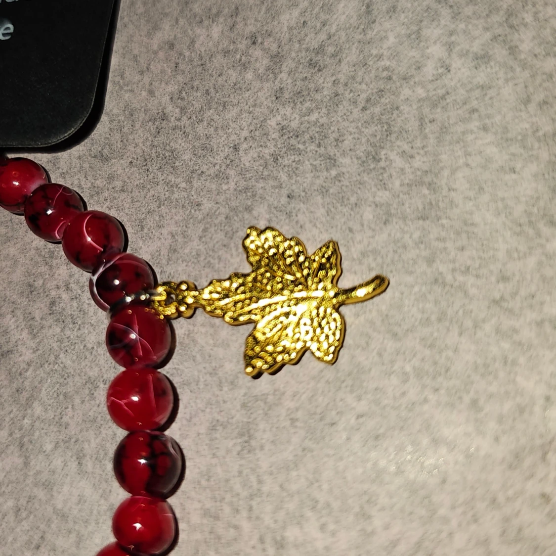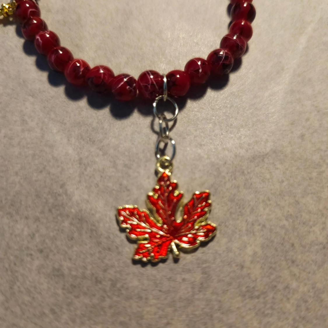 Unikt armband med röda pärlor med mönster, dekorerat med tre hängande lönnlöv i guld och rött. Löven ger en höstig vibe och pärlorna har en cool marmorerad look. Perfekt accessoar för dig som vill sticka ut med detaljer. Ca 16cm, gjort av 4mm glaspärlor