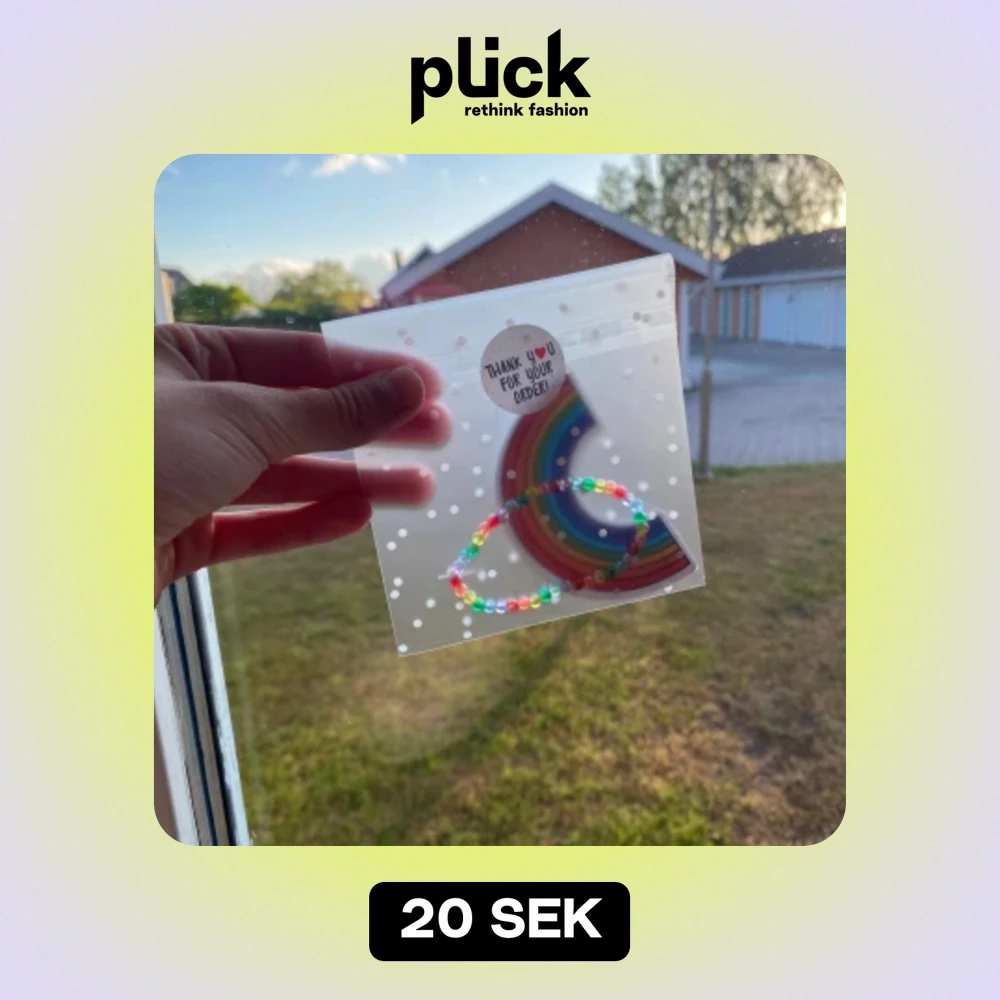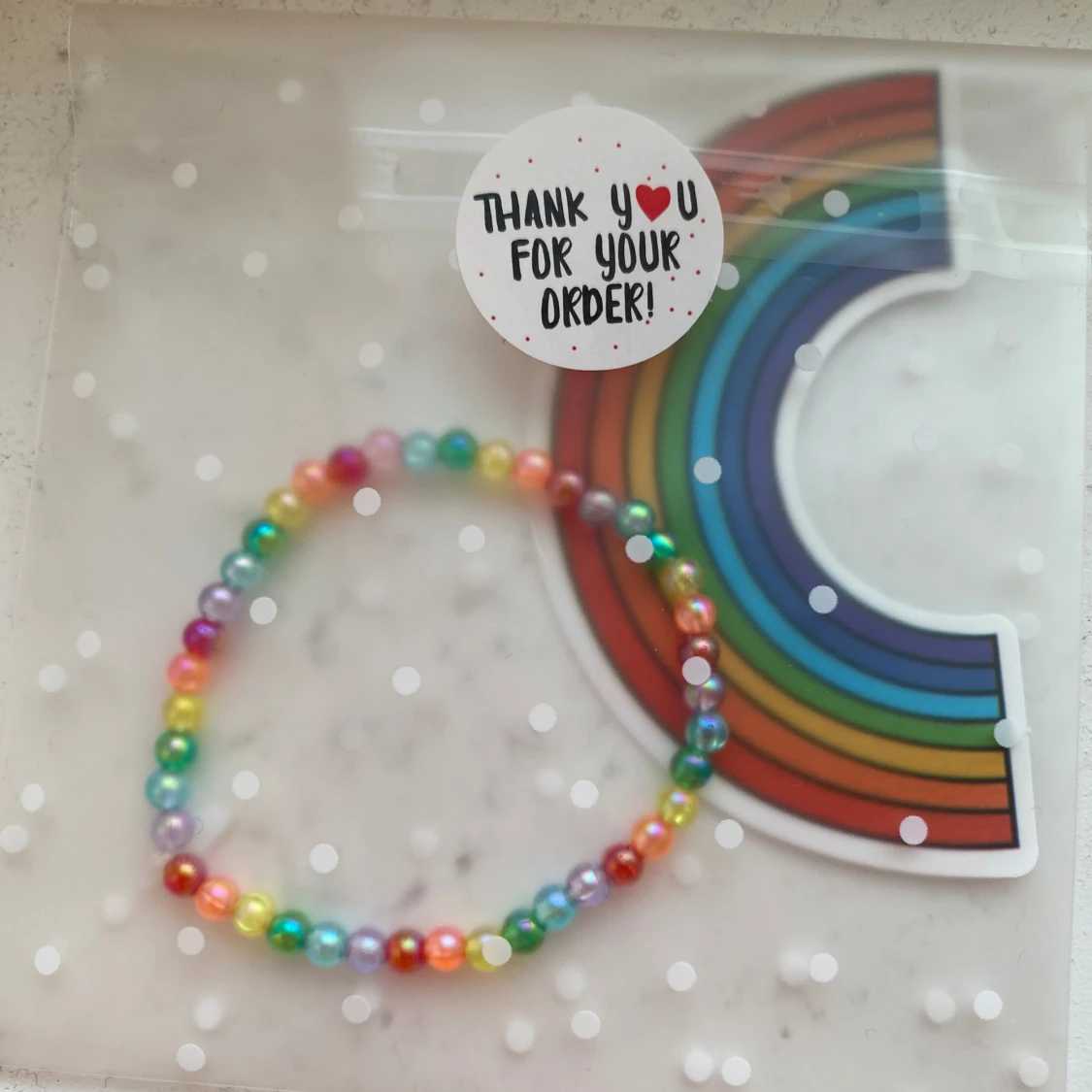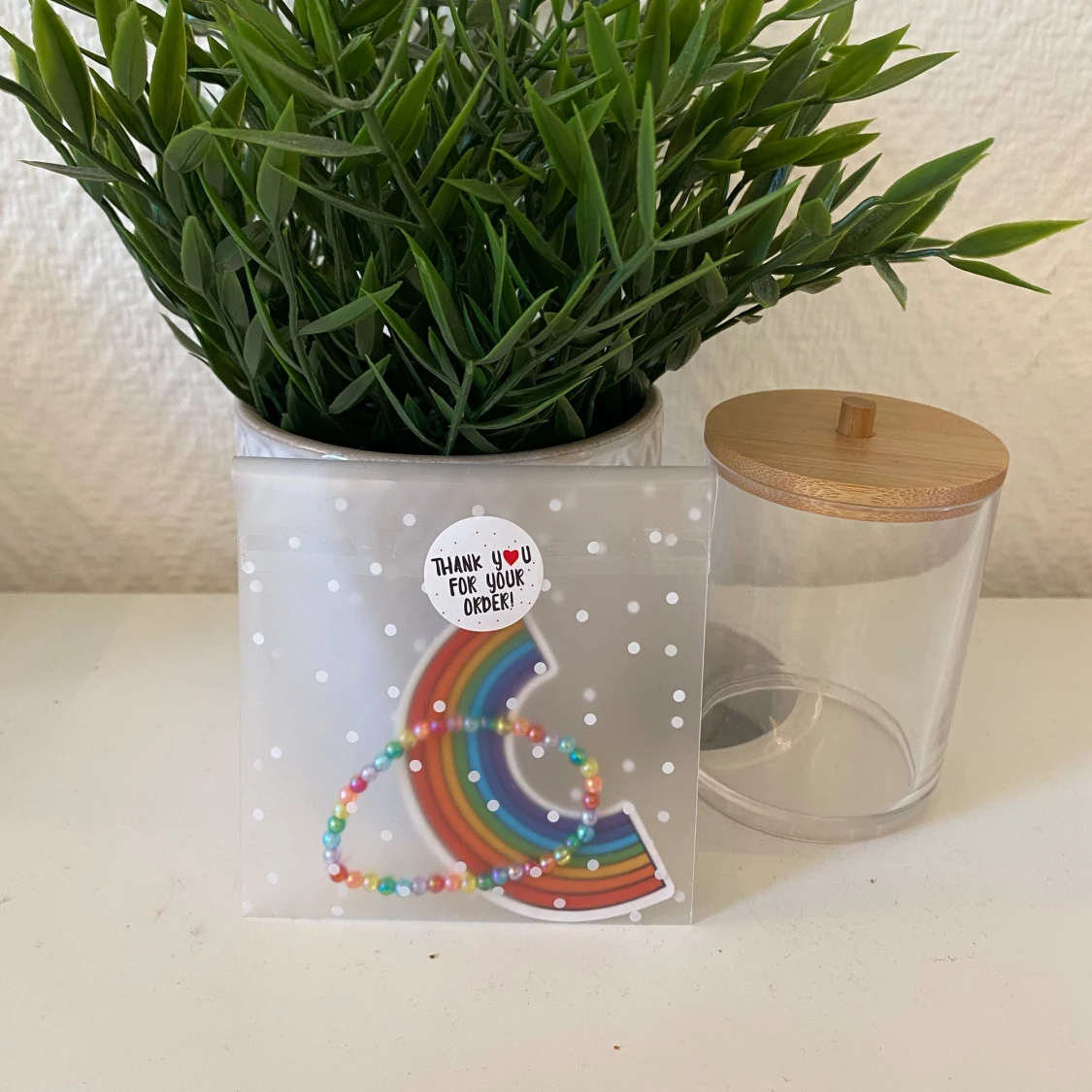 Vi säljer detta regnbåge armandet som är handgjort. Det ingår ett grattis klistermärke.