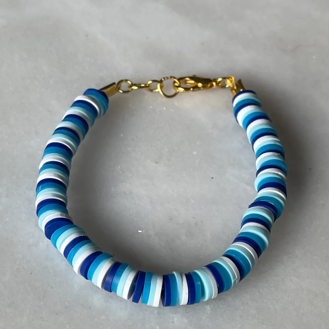 Super fint och trendigt armband i olika blåa nyanser och med en vit färg i. Ingår spänne och ringödlor så man kan justera det efter önskan.