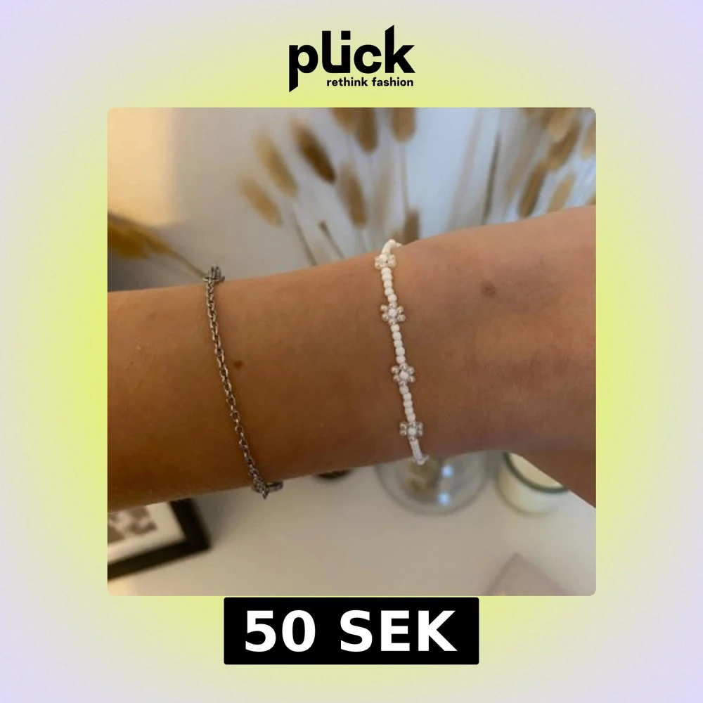 Supergulligt minimalistiskt egentillverkat armband med små vita pärlor och blommor av pärlor längs hela bandet. Armbandet har en silverfärgad kedja och lås för justering🤍