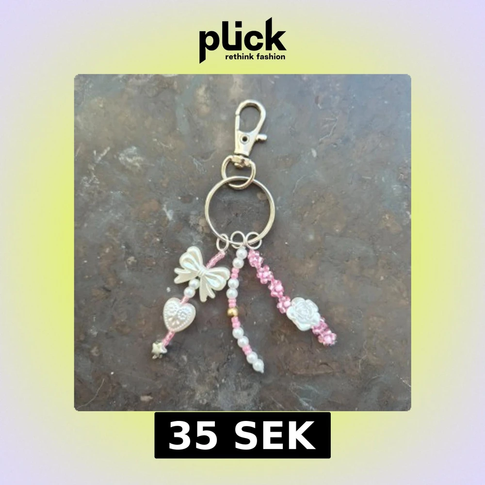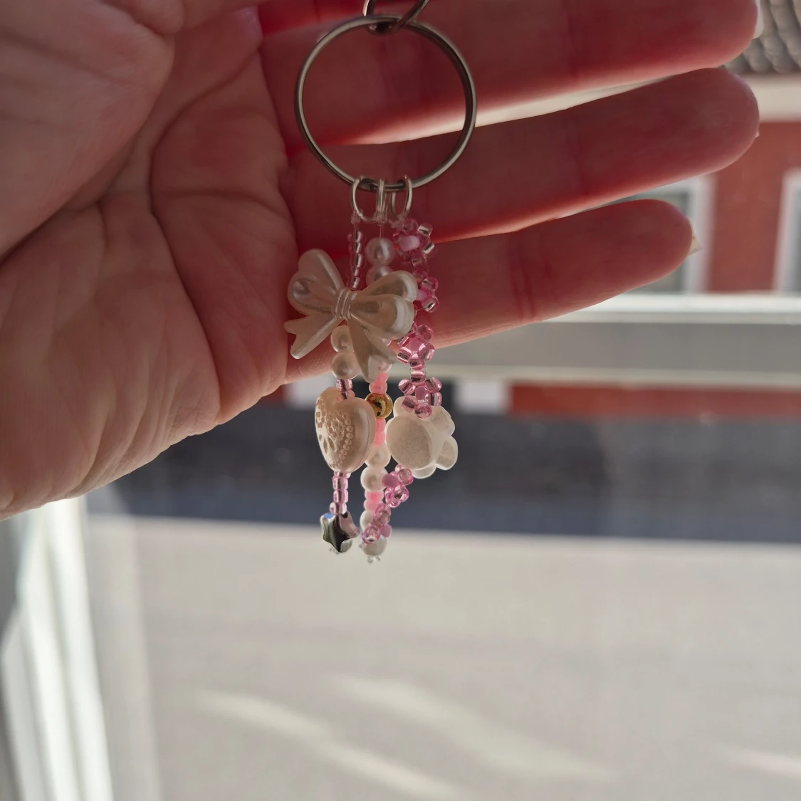 Handgjord Söt nyckelring med detaljer i vitt och rosa. Dekorerad med en pärlrosett, hjärta och blomma samt små pärlor i olika former. Perfekt som accessoar till väskan eller nycklarna.