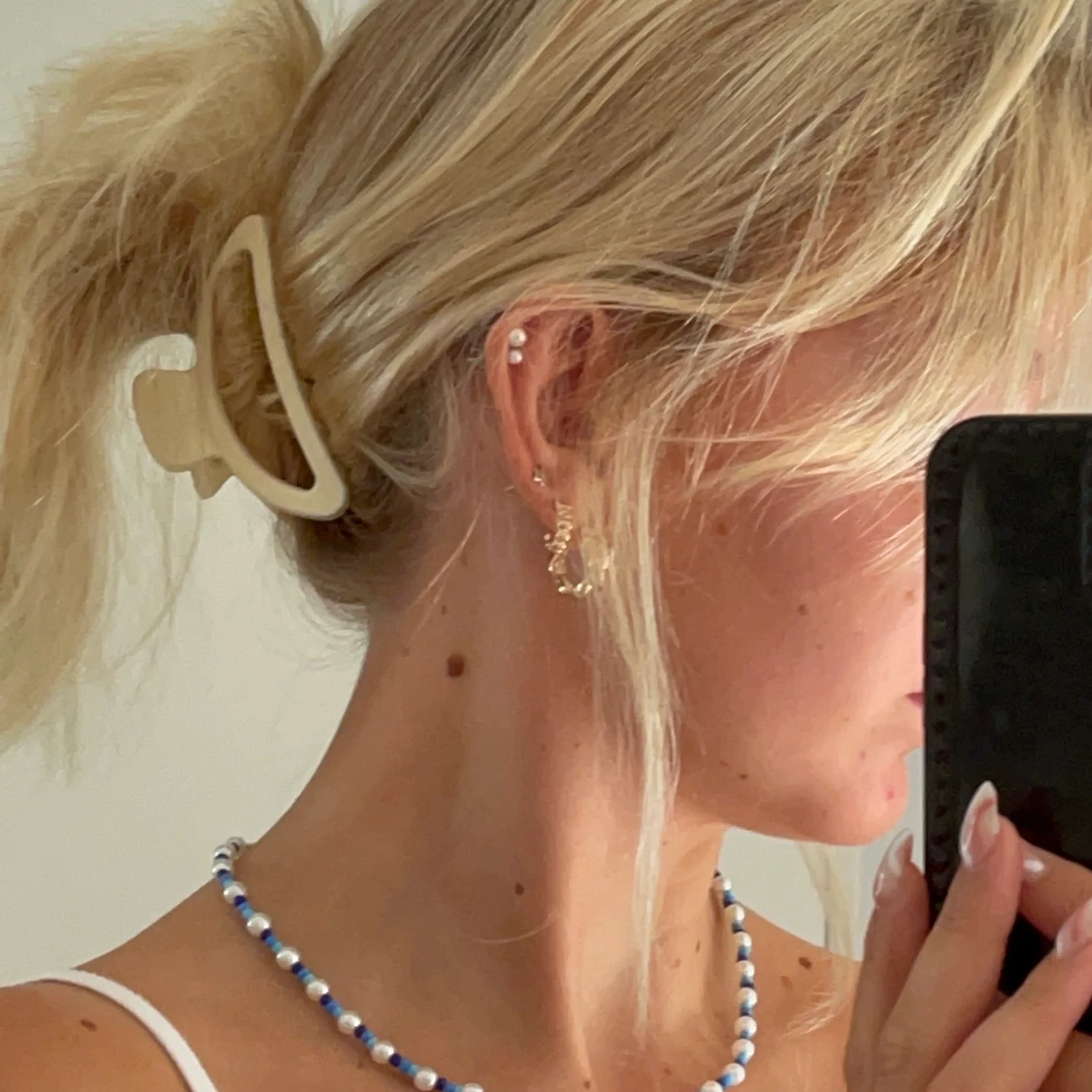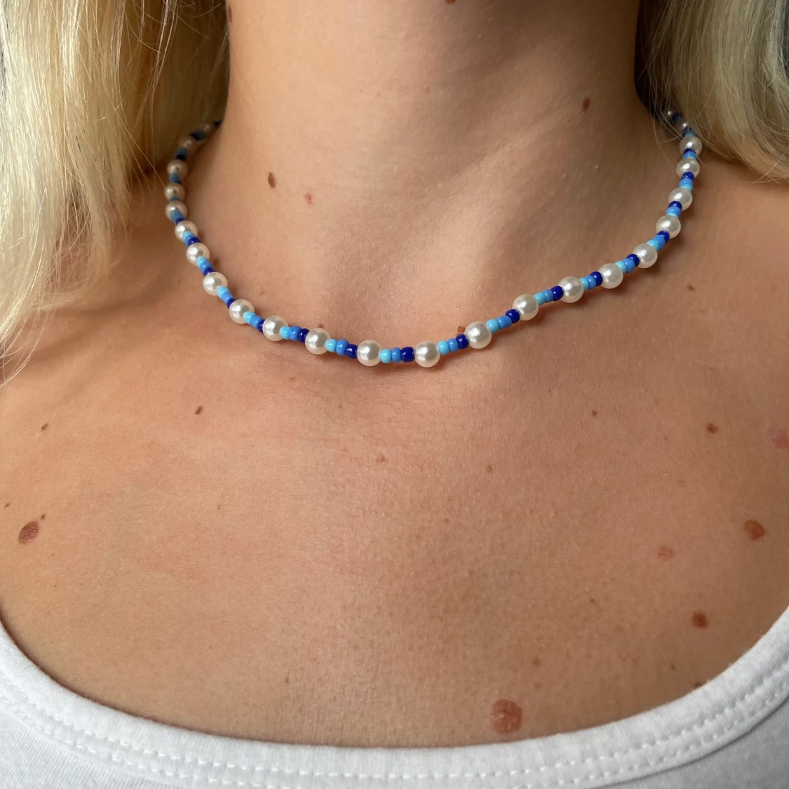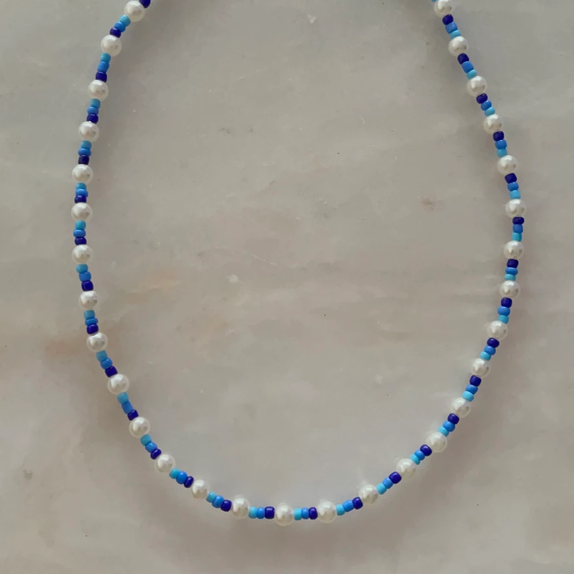 Jättefint handgjort halsband i tre olika nyanser av blå färg samt med vita stora pärlor💙 perfekt till ett par blåa jeans eller bara ett vitt linne för att stylea upp outfiten 💙tråden är elastiskt samt att det tillkommer spänne vilket gör att halsbandet är justerbart 💙🤍