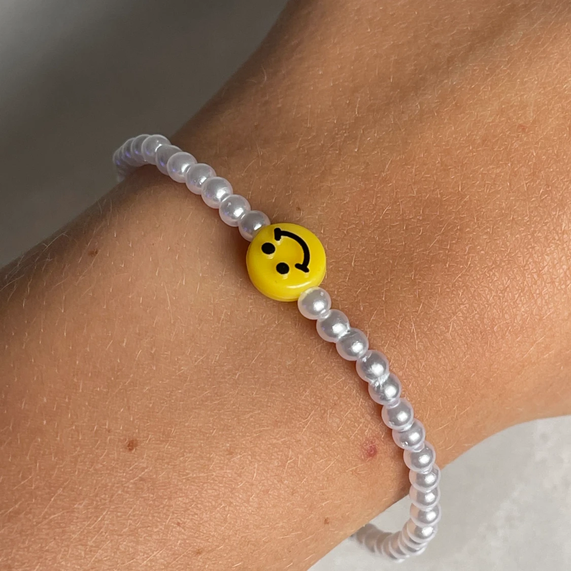 Ett jättefint och trendigt smiley armband med vita små pärlor och en smiley i mitten. Ingår spänne och ringödlor. Man väljer själv storlek