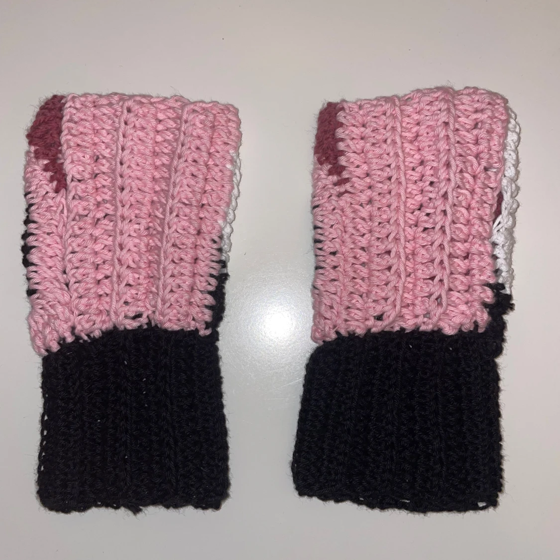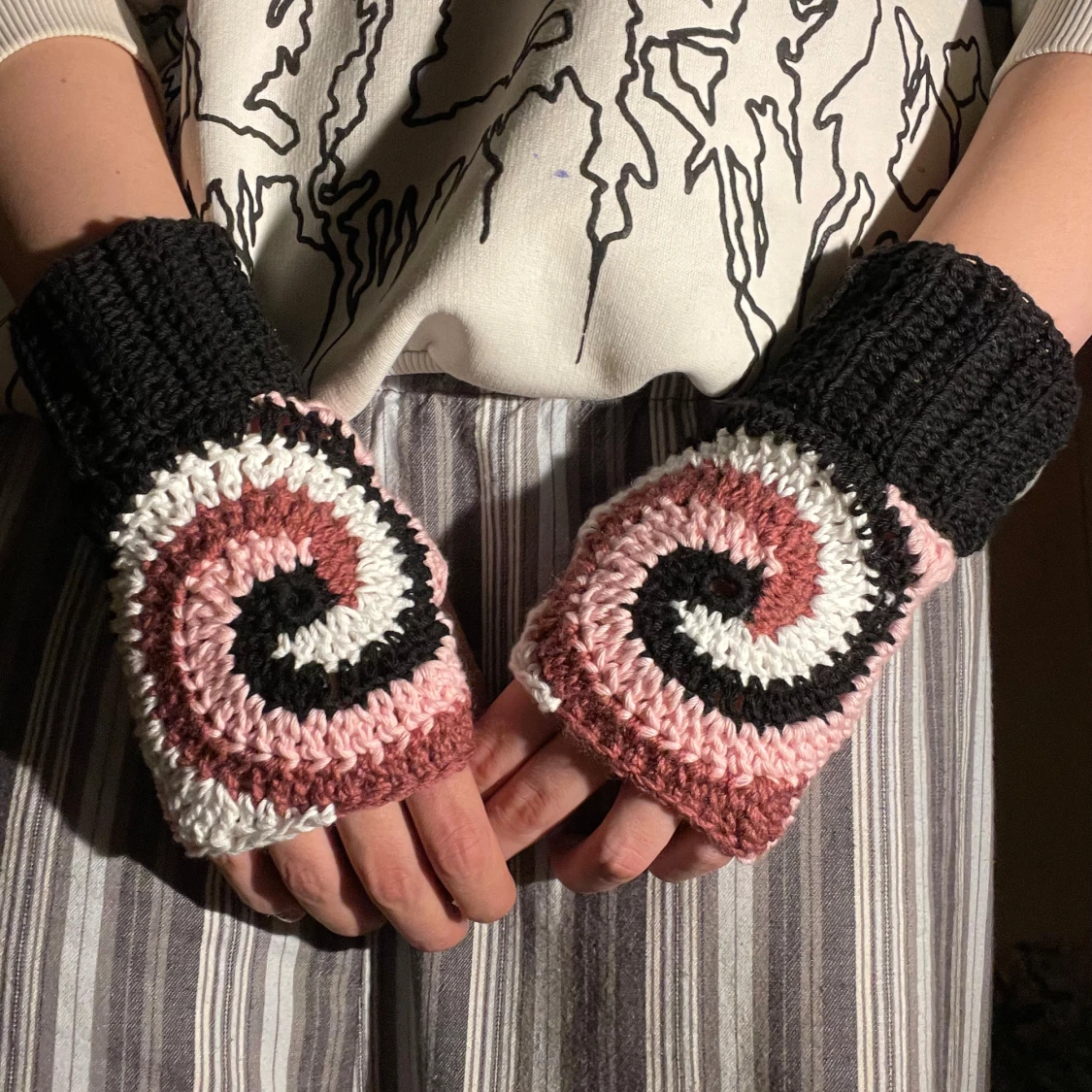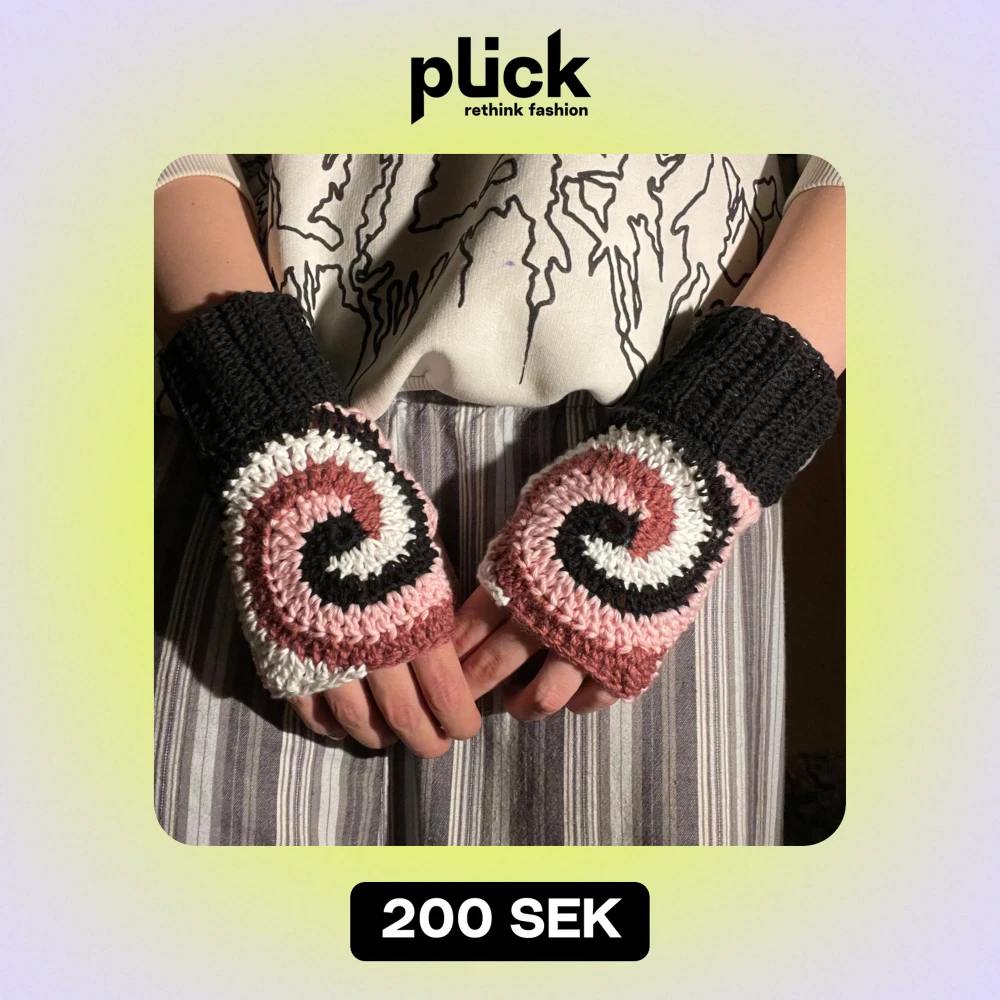 Säljer ett par unika virkade handledsvärmare med en cool spiraldesign i svart, vitt och rosa. Perfekta för att hålla händerna varma under kyliga dagar. De är handgjorda och har en bekväm passform med ribbstickade muddar. Perfekt accessoar för vintern!