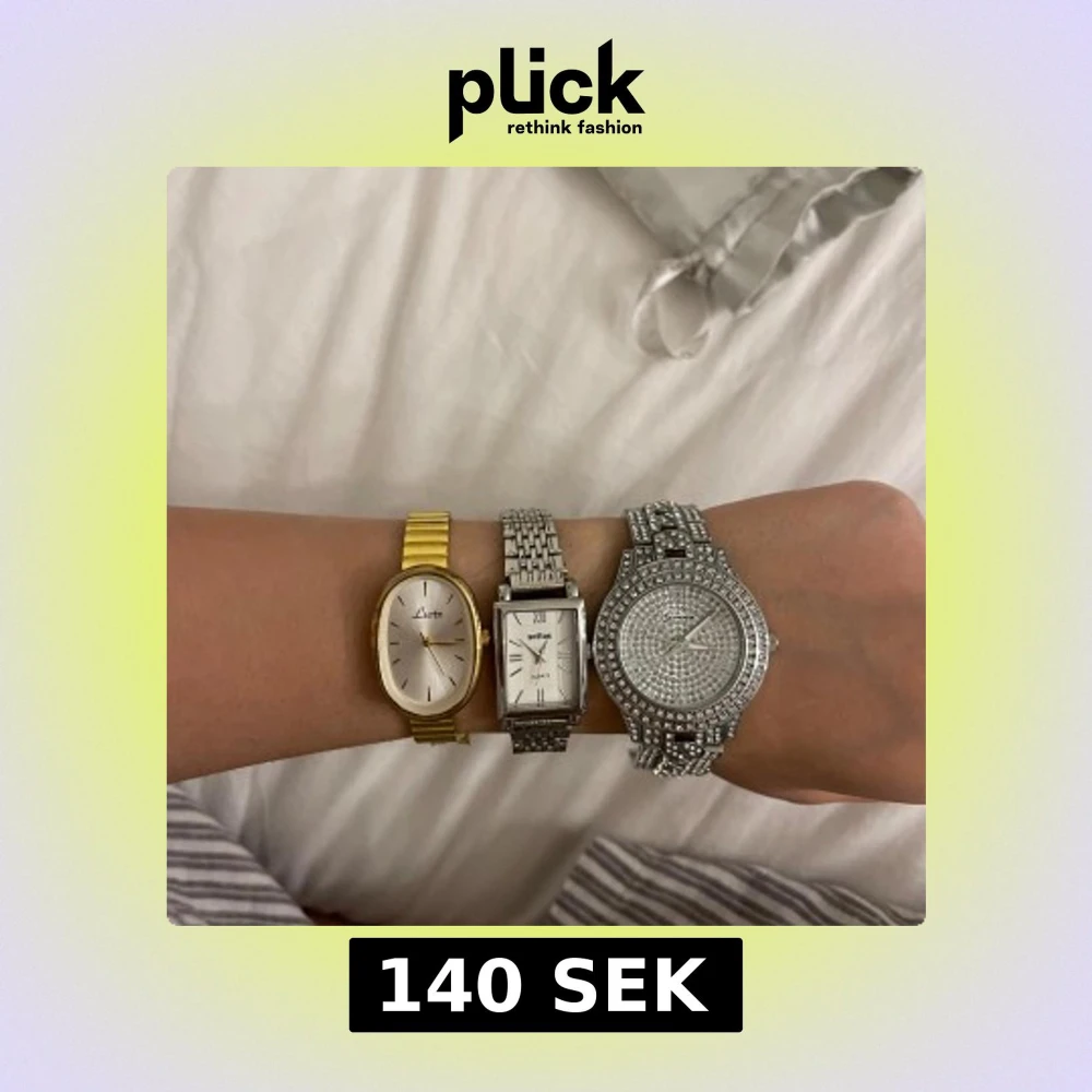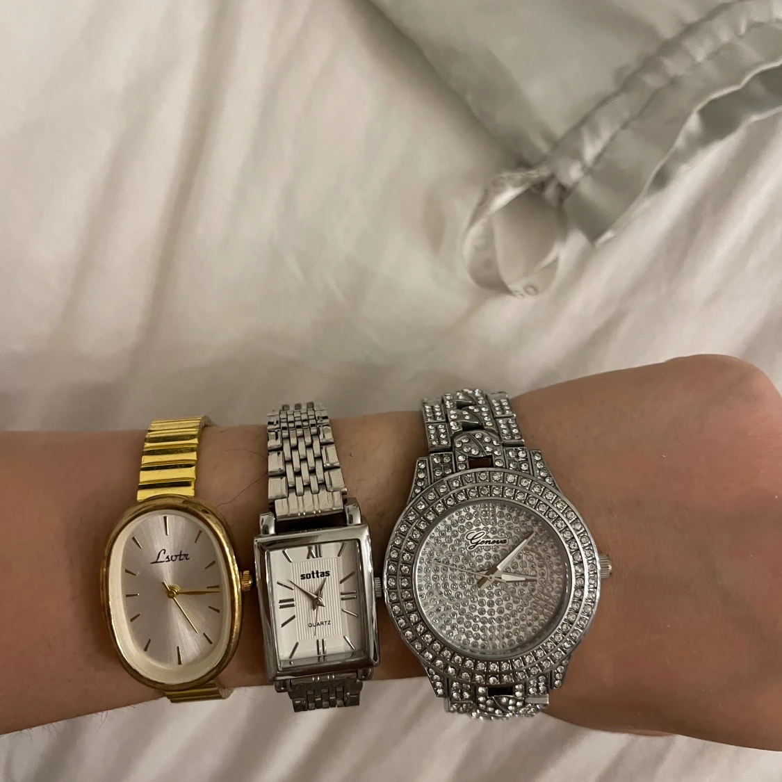 Säljer tre snygga armbandsur: en guldig oval klocka från Lsvtr, en silverfärgad rektangulär klocka från Sottas och en rund, glittrig klocka från Geneva med massor av stenar. Alla har metallarmband och klassisk design som sticker ut.