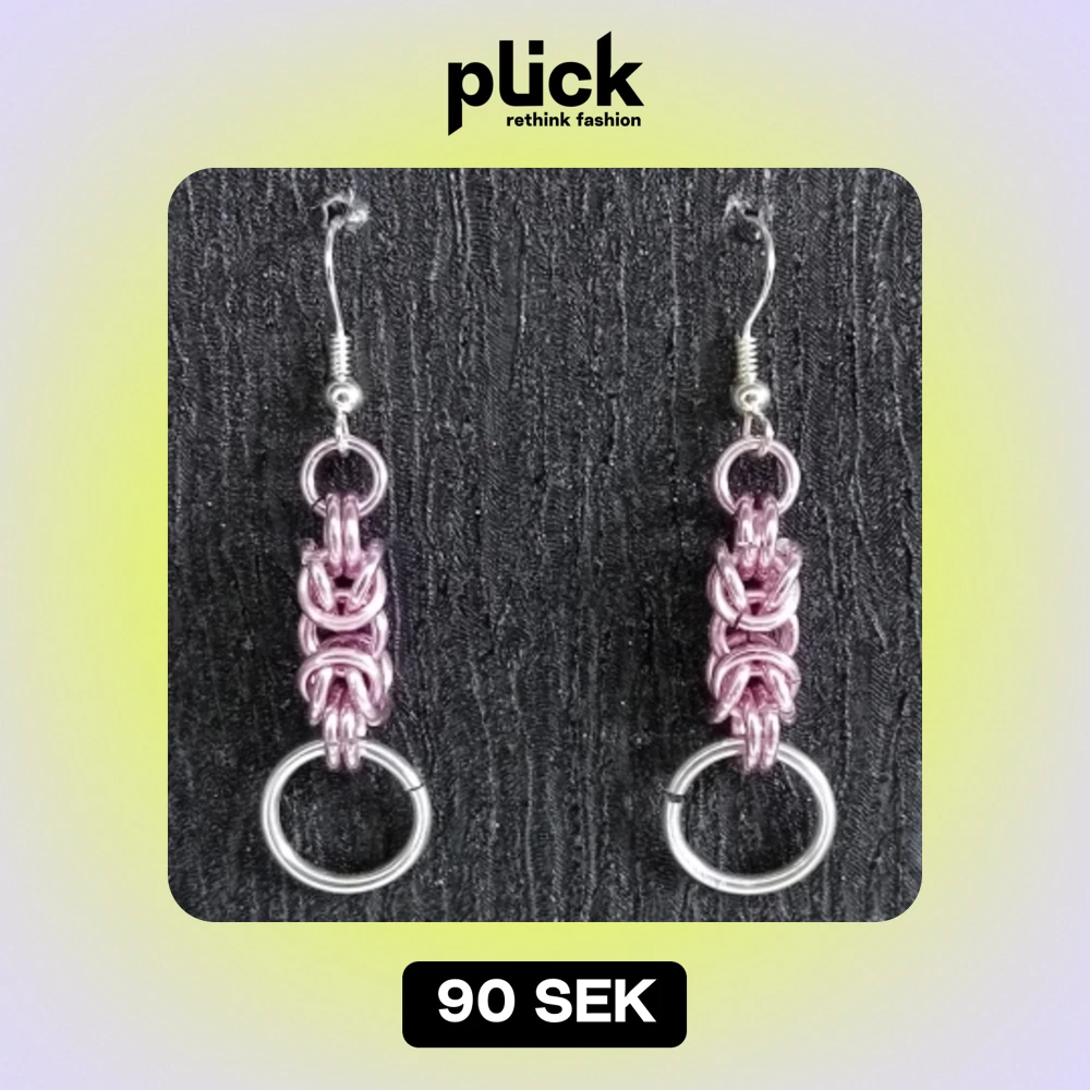 Ett par örhängen gjorda med rosa och silver ringer mått (ca 4.3 cm långa). Öronkroken är nickelsäker