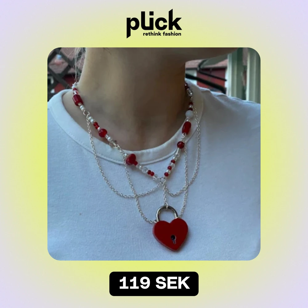 Halsband gjort av mig med glaspärlor, kedjor och ett hjärtlås! 43 cm långt och tyngre i fram pga låset. Aldrig använt. Kan kompletteras med ett par örhängen med nycklarna tillhörande låset, hjärtan även de med! DM