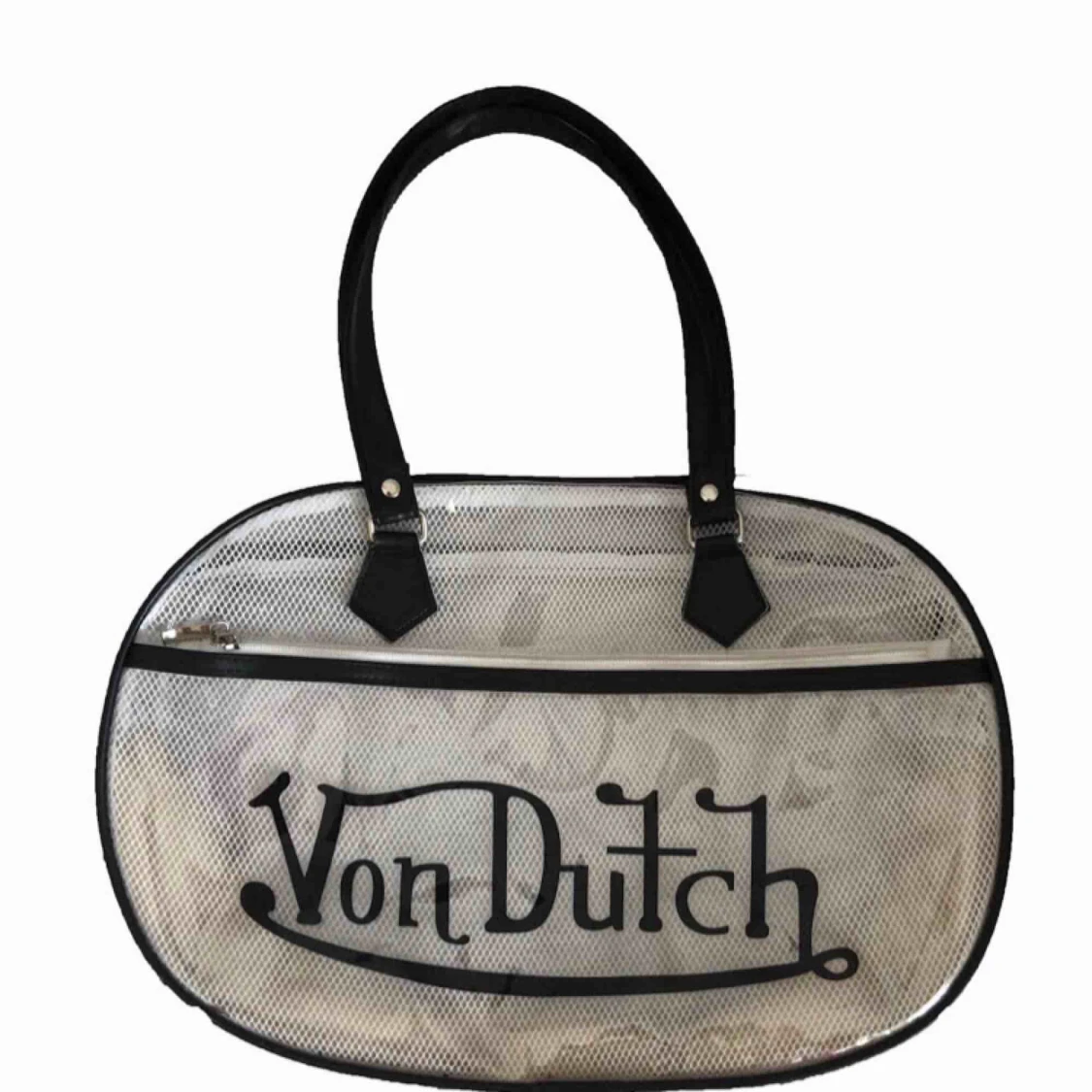 Säljer denna Sjukt snygga men även unika väska från märket Von Dutch. Väskan är genomskinligt med nät inuti och pryds av en stor printad logga