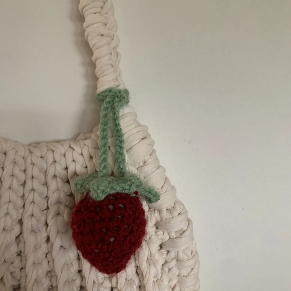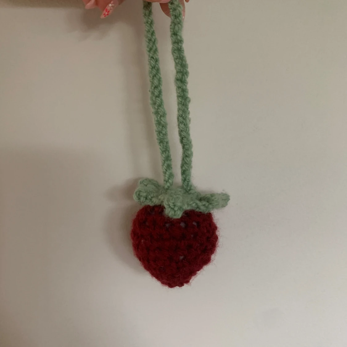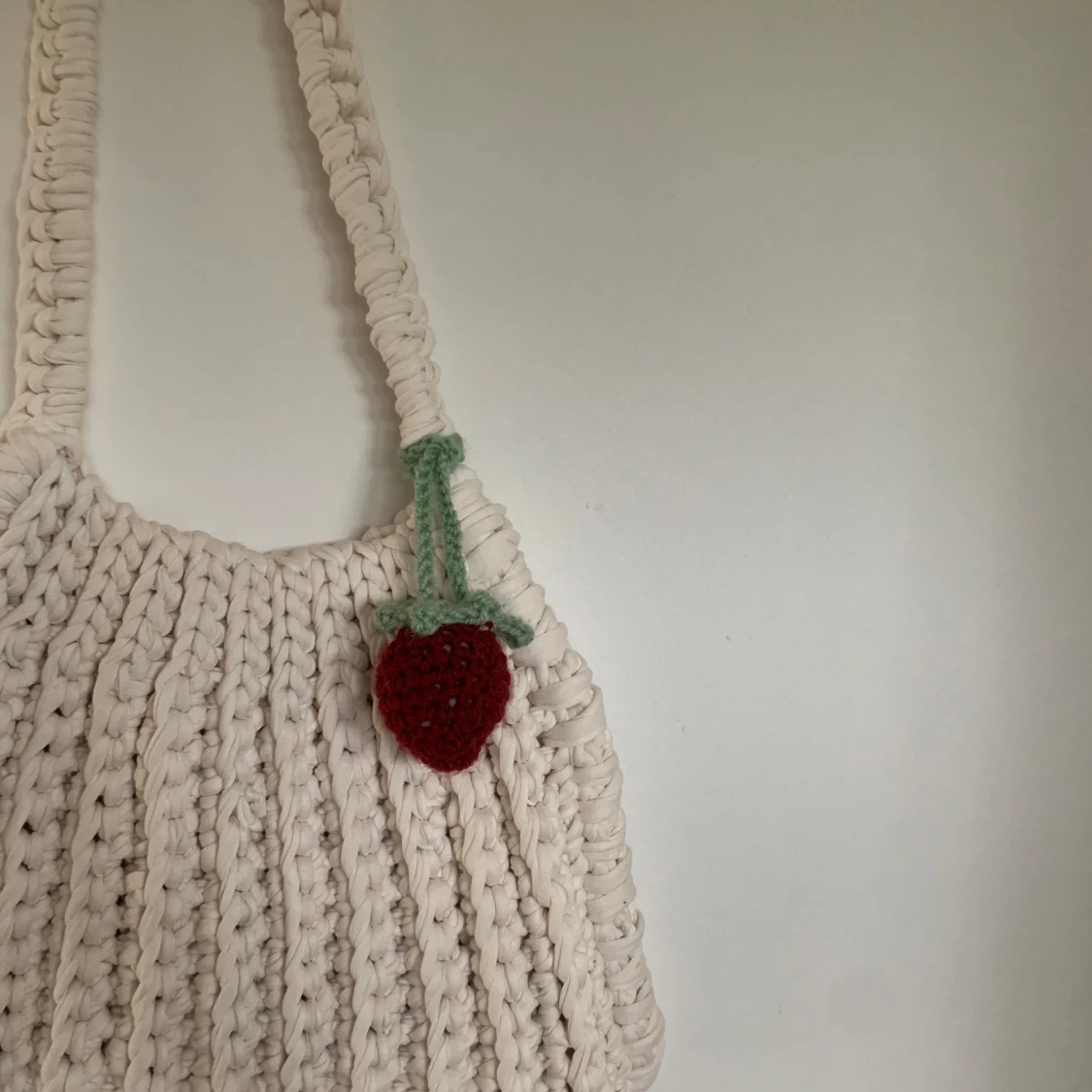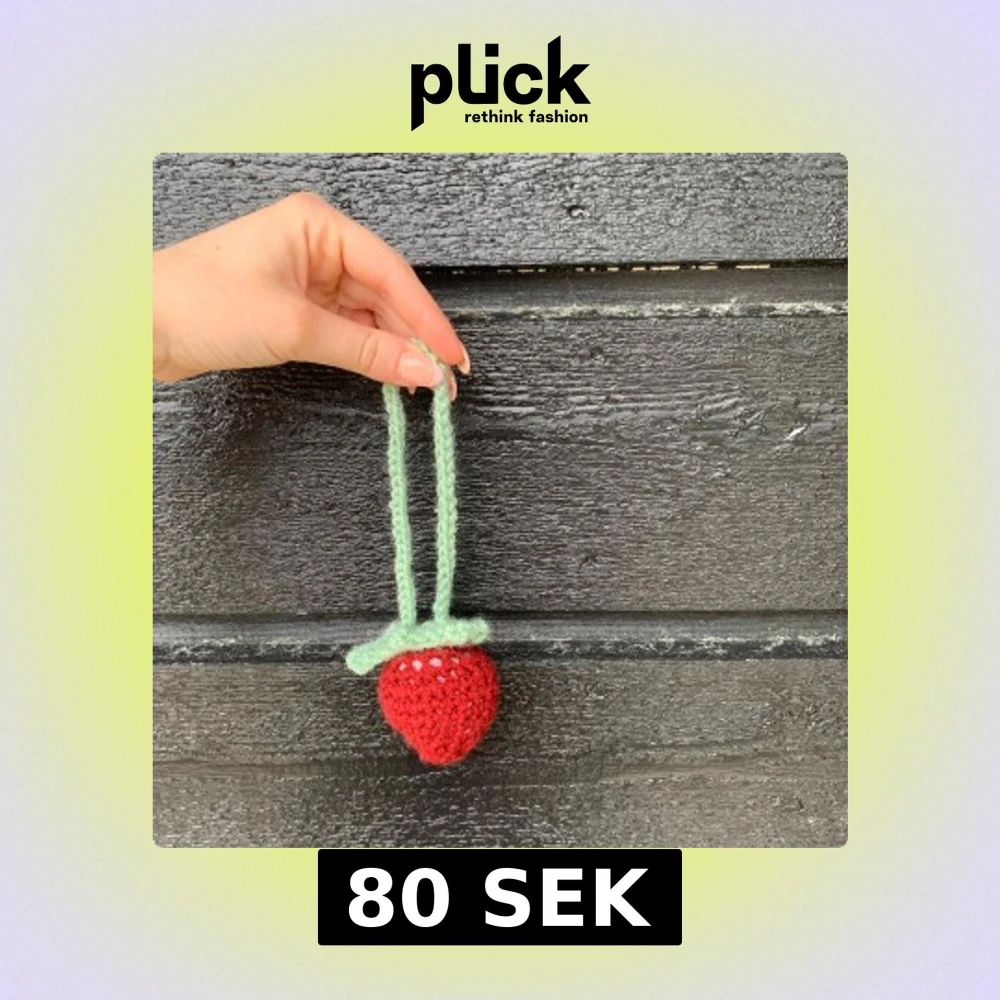 Supersöt liten virkad jordgubbe med röd botten och ljusgröna detaljer. Perfekt som accessoar / nyckelring. Jordgubben har två gröna handtag och är lätt att fästa på exempelvis en väska eller nyckel. Köp med väska = 50kr.