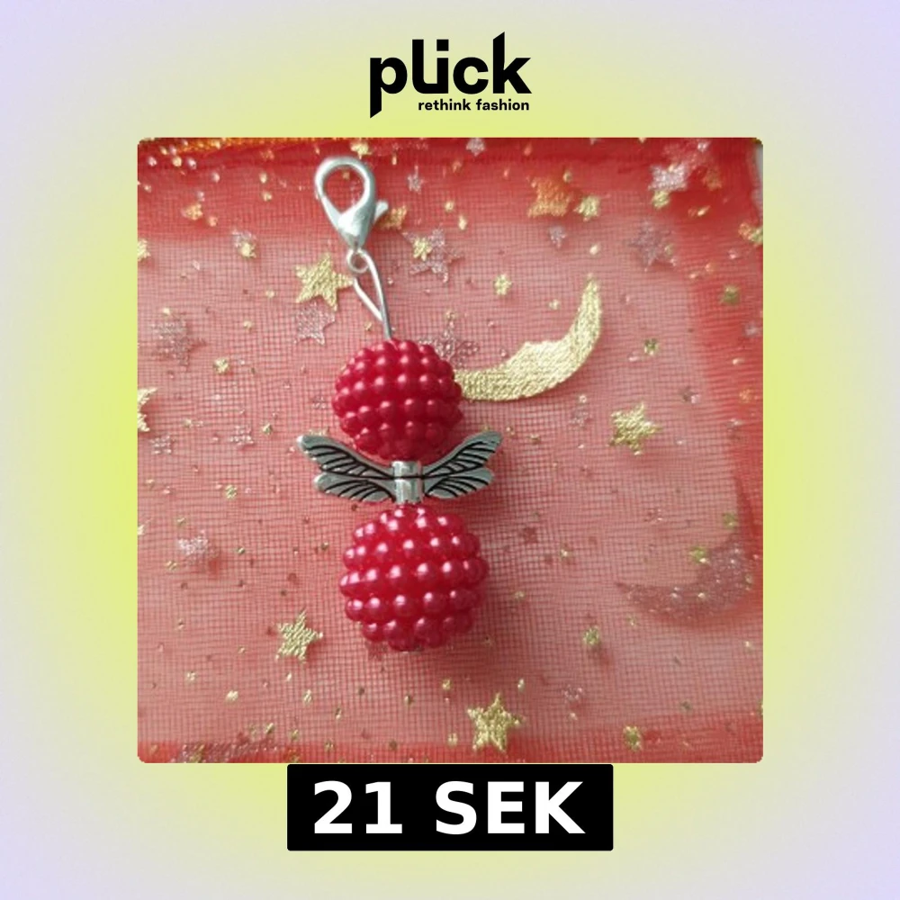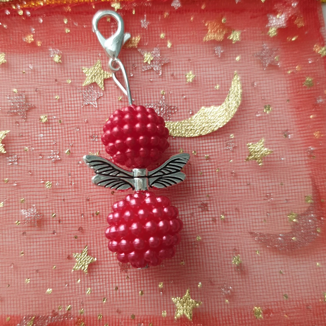 Unik berlock med två röda hallonformade pärlor och detaljerade silverfärgade vingar mellan dem. Perfekt att hänga på halsband eller armband för en söt och lekfull look. Fästet är i silverfärg och gör det enkelt att sätta fast på din favoritkedja. Handgjord smyckesängel