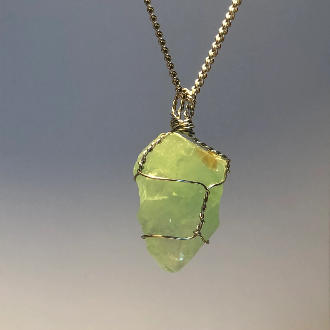 Ett fint hängsmycke i smaragdgrön kalcit invirad i rostfritt stål. Handgjord och oanvänd. Skriv vid intresse:) Obs frakt kostar 12 kr och kedjan ingår ej!