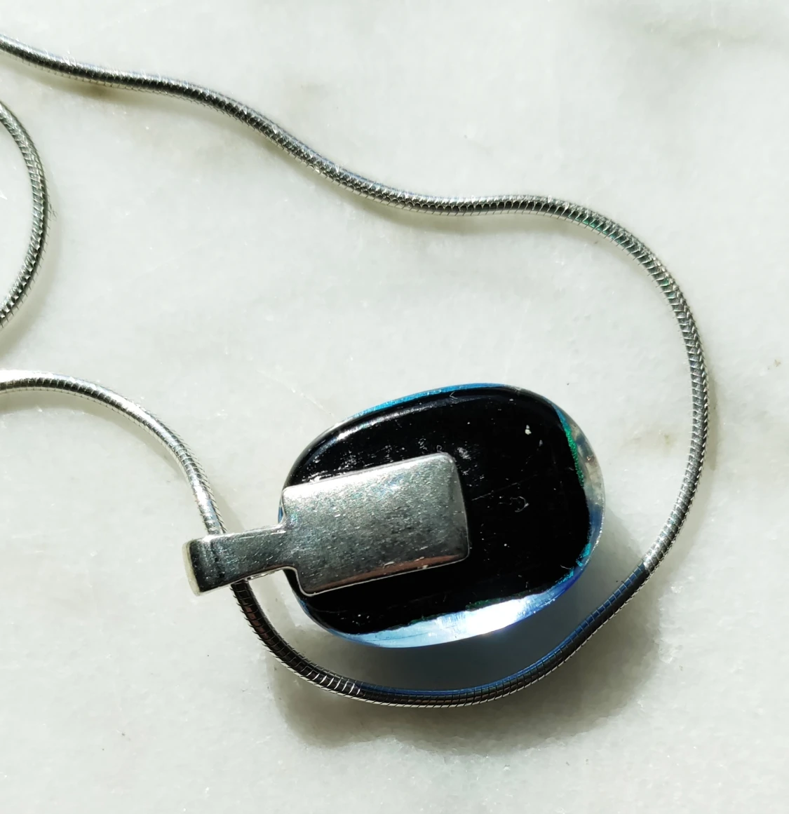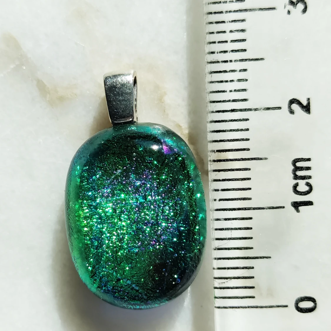 Hängsmycke i grönskimrande glas, silverpläterat hänge. Glaspärlan mäter ca 2 cm. Kedjan (Sterlingsilver 925) kan köpas separat.