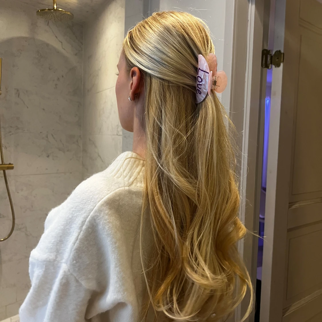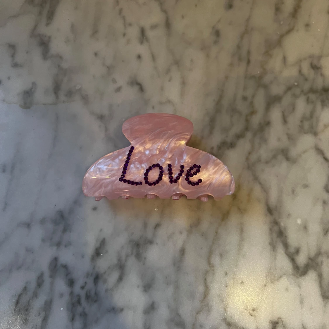 Söt rosa hårklämma med pärlbroderad text 'Love'. Perfekt för att ge en romantisk touch till din frisyr. Klämman har en skimrande yta som fångar ljuset fint. Lila/vinröd text. Oanvänd, endast testad för bilden!