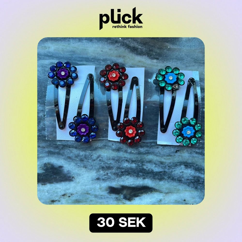Snygga hårklämmor med blommor i olika färger. Perfekt för att sätta upp håret eller som en fin detalj i håret. Totalt finns det 3 par, kan sälja det parvis eller alla tre par tillsammans. 1 par kostar 10 kr.