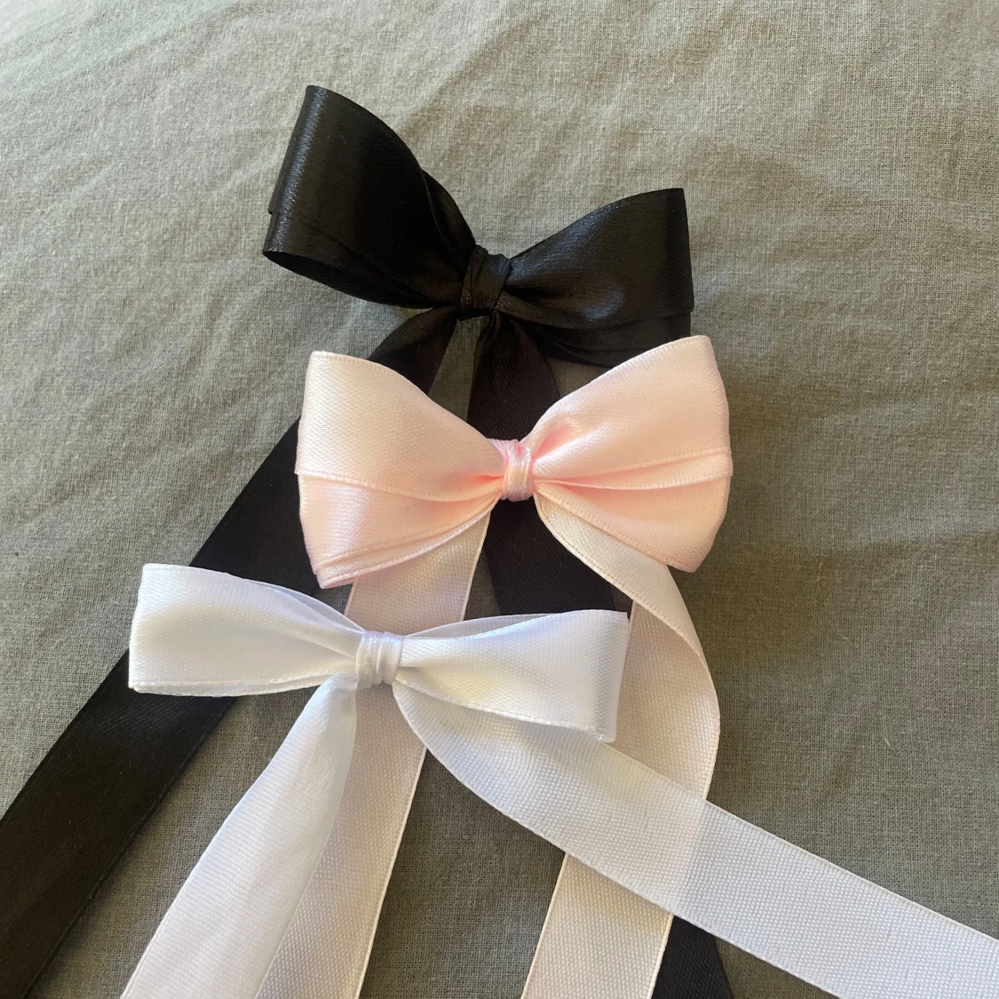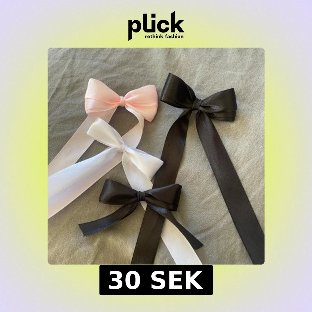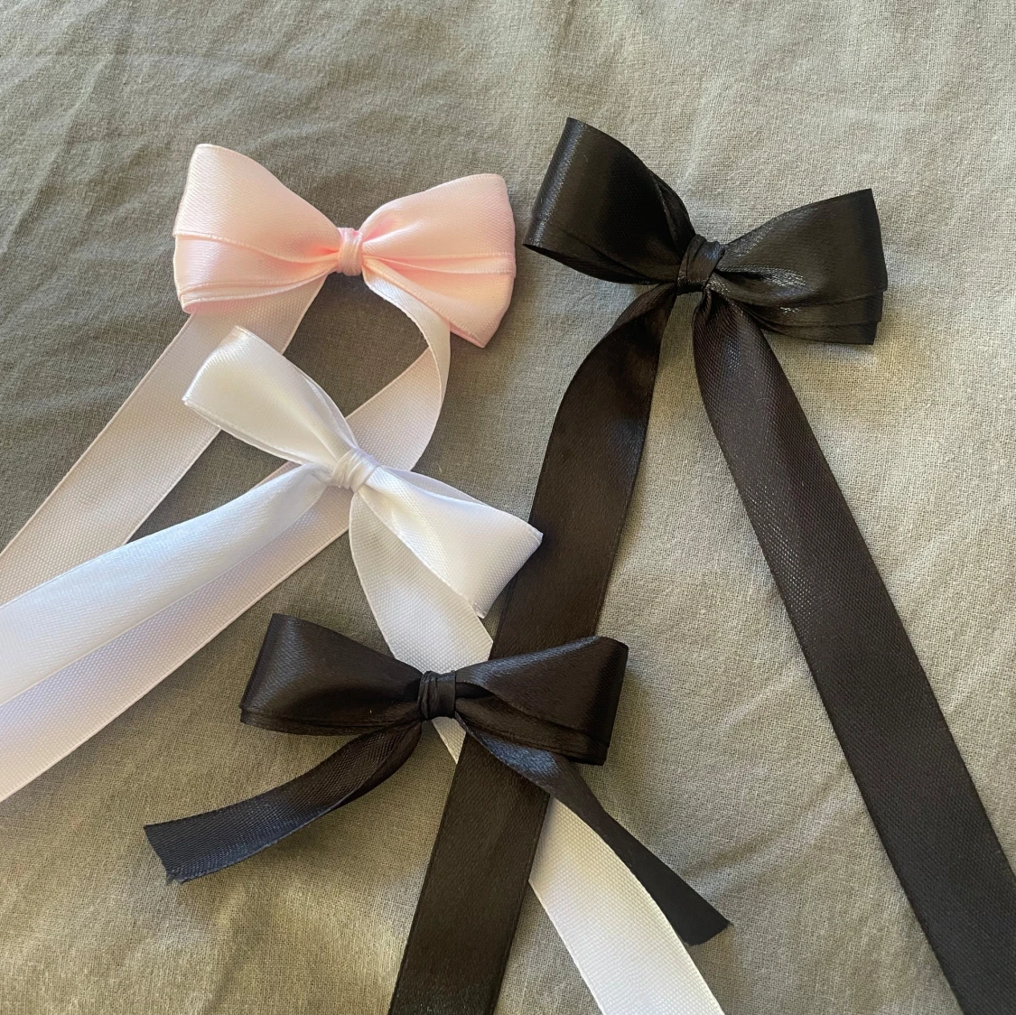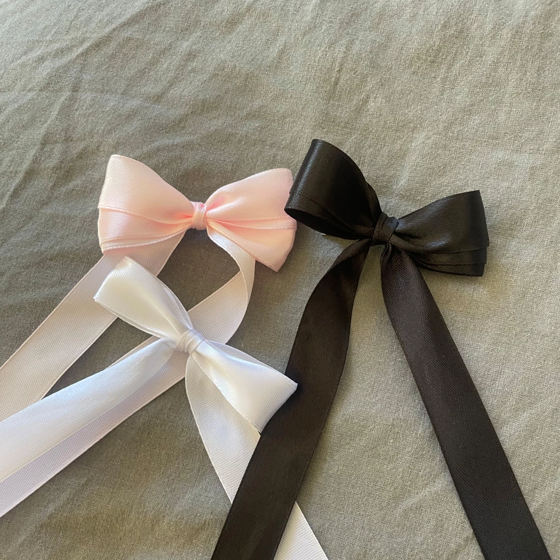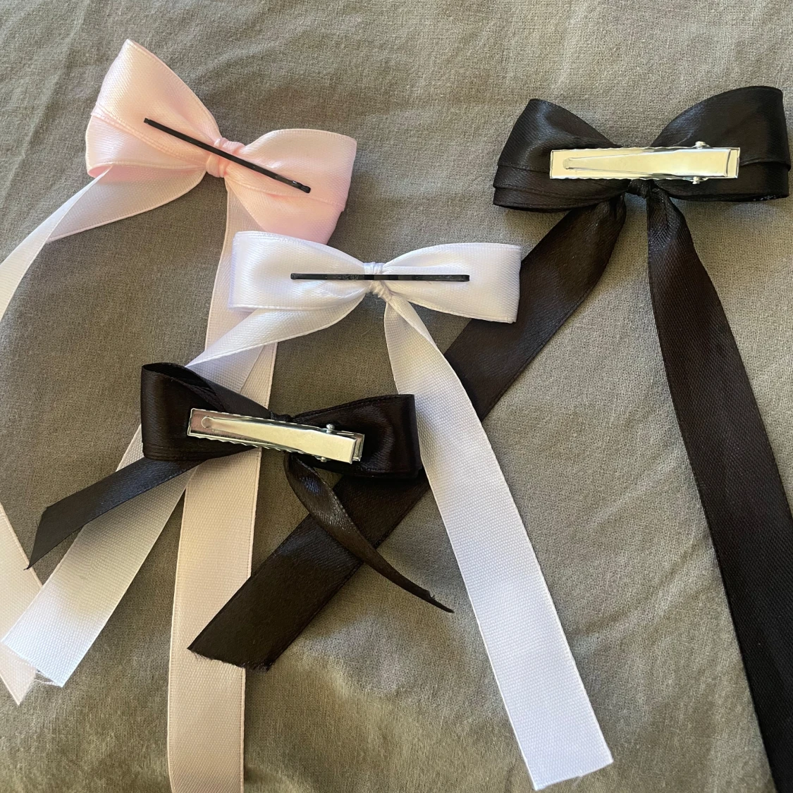 Säljer tre eleganta hårrosetter i svart, vitt och rosa. Varje rosett har långa band och en praktisk klämma på baksidan för enkel fastsättning i håret. Perfekt för att ge en söt och stilren touch till din frisyr.🖤💖3 för 30 oavsett design och färg