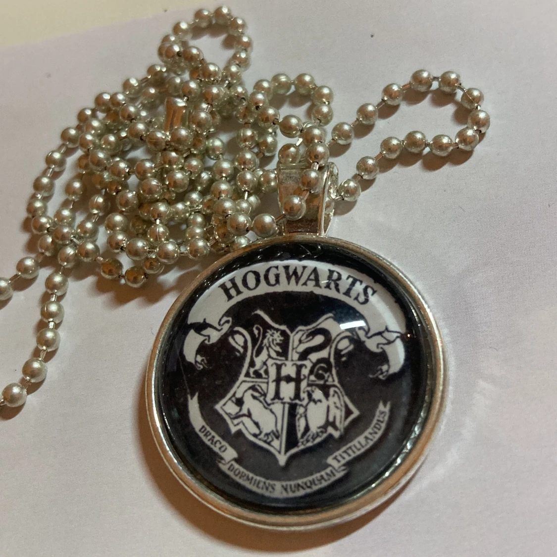 Nice halsband med Hogwarts loggan, handgjort av mig. Själva berlocken mäter ca 2,5cm och sitter på en ca 30cm lång kedja (stängd), kan korta kedjan till önskad längd! Vanligt frimärke går på 13kr. Se sista bild för allmän info ❤️