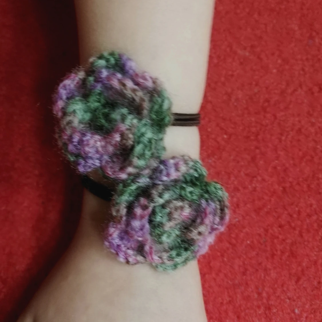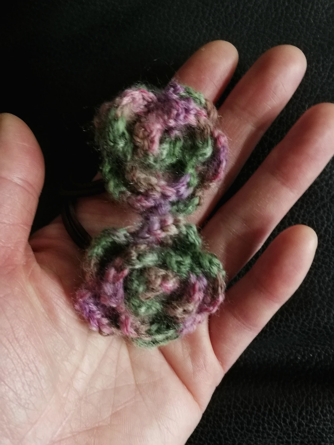 Ett par rosor hårsnoddar. Nytt. Virkade av mig. Väldigt fint. Foton kan inte visa det på riktig fint. Gummiband är 5cm. Dubbel gummiband.