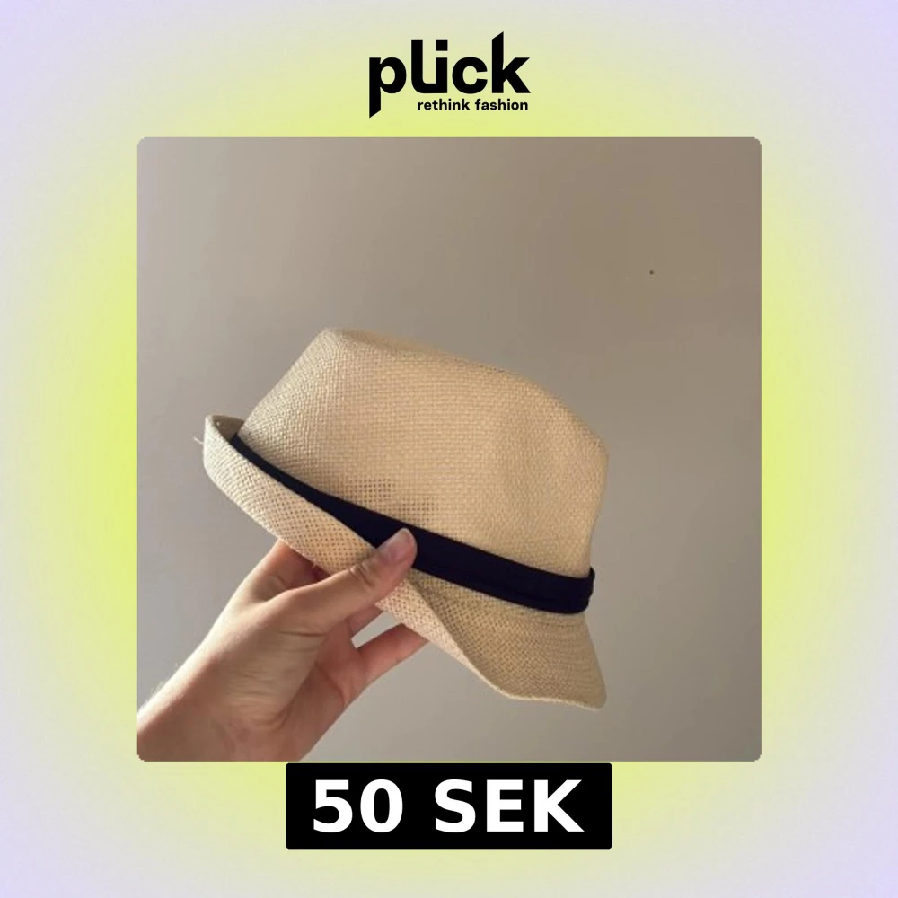 Snygg beige stråhatt från New Yorker med klassisk form och svart band runt kullen. Hatten är lätt och luftig, tillverkad i syntetmaterial som påminner om strå. Storlek S/M. I fint skick.