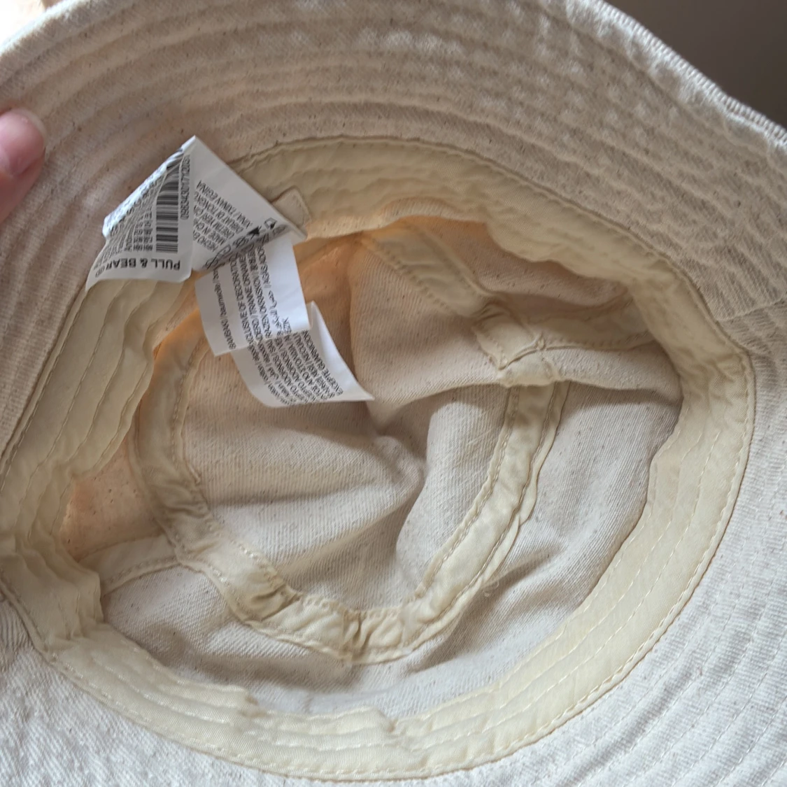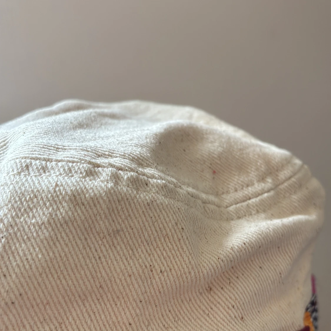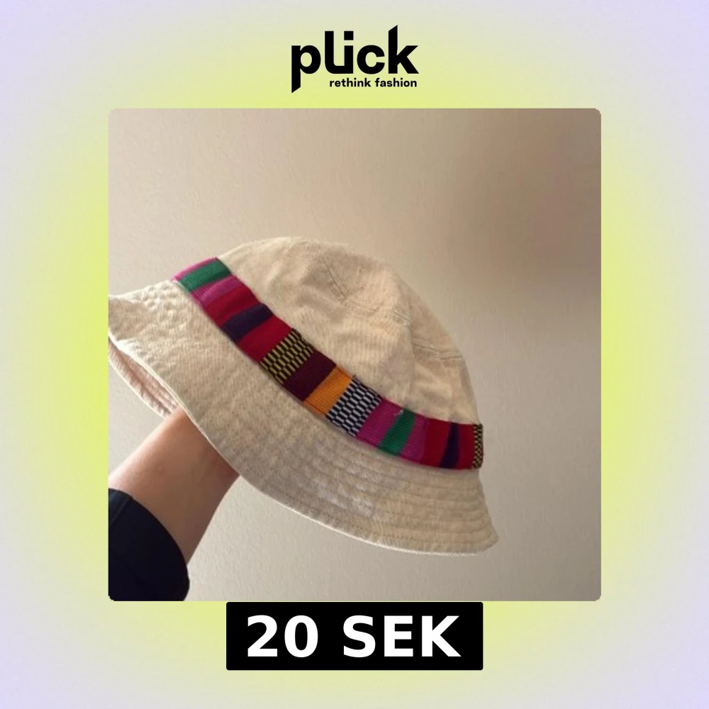 Bucket hat i vit tyg från Pull & Bear med en bred, färgglad rand runt hatten. Randen har inslag av grönt, rosa, lila, gult, orange och svart i ett randigt mönster. Hatten ser väldigt använd ut, men har använt ett fåtal gånger och är i fint skick annars. Storlek M.