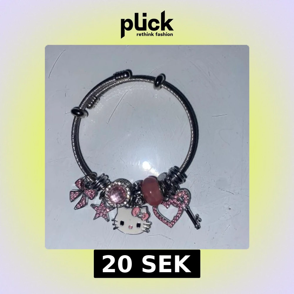 Snyggt silverfärgat armband med flera berlocker, bland annat Hello Kitty, stjärna, rosett, hjärta och nyckel. Berlockerna är dekorerade med rosa stenar och detaljer.💕🥰