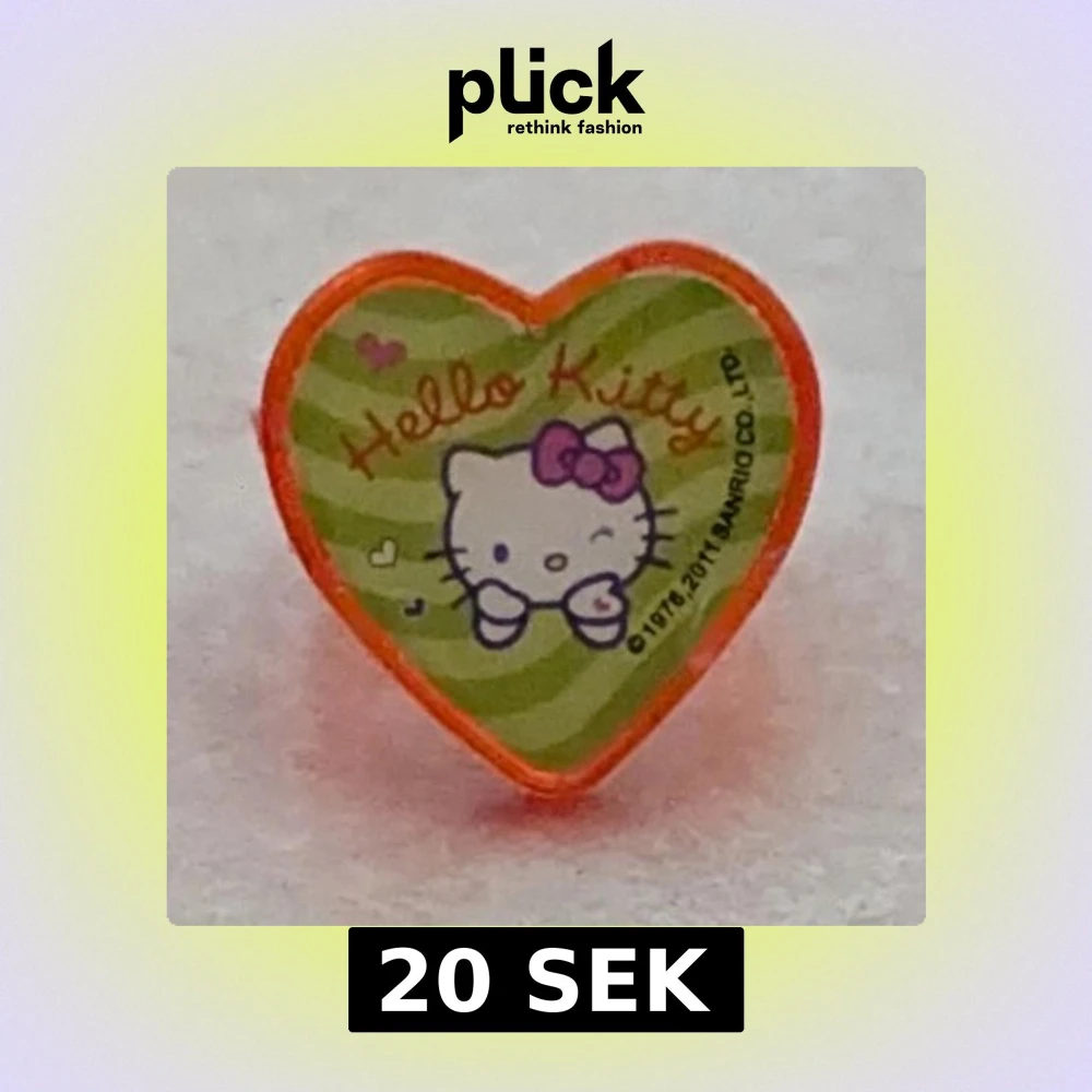 Supergullig ring i orange plast med ett hjärtformat motiv av Hello Kitty. Ringen har gröna och ljusgröna ränder, lila och rosa detaljer samt texten 'Hello Kitty' i orange. Perfekt för dig som älskar Hello Kitty och vill ha något unikt på fingret! Ringen har en mindre defekt på plast hjärtat visas på bild.