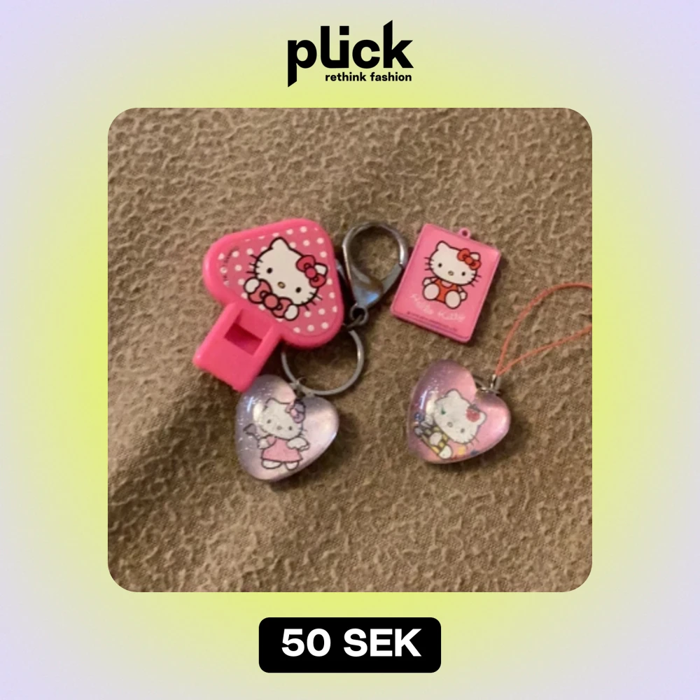 En samling av Hello Kitty smycken som inkluderar två hjärtformade hängen med Hello Kitty-motiv, en rosa nyckelring med ett hjärta och en rosa rektangulär nyckelring med Hello Kitty-motiv.