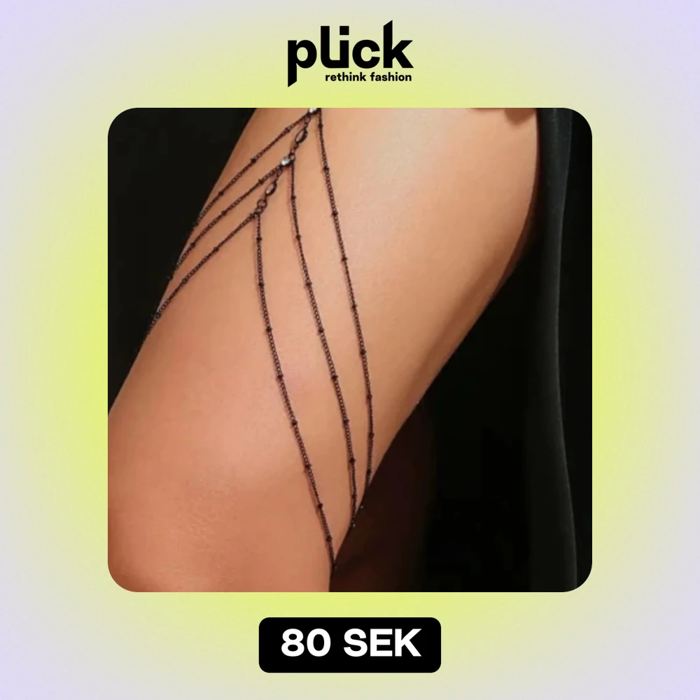 Snygg och unik svart benkedja som verkligen sticker ut! Den har flera tunna kedjor som hänger ner och är dekorerad med glittrande strassdetaljer. Perfekt för att ge din outfit en extra edge, kanske till en fest eller en speciell kväll.