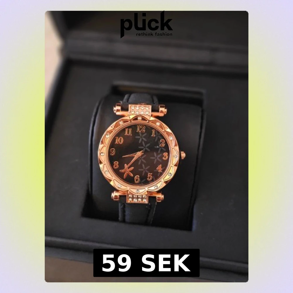 Snygg klocka med svart urtavla och blommönster, omgiven av en guldig ram med glittrande stenar. Armbandet är svart på ovansidan och beige på undersidan, gjort i syntetmaterial. Siffrorna är i guld och ger en lyxig vibe. Perfekt accessoar för att lyfta din stil.