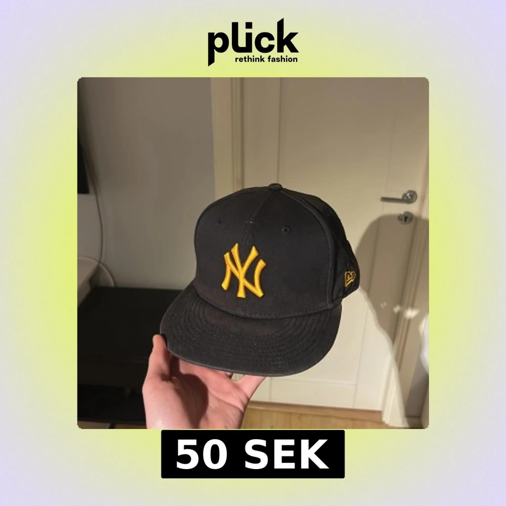 Snygg mörkblå keps från New Era med gul broderad logga framtill. Lite missfärgning på böjen men annars super. Bra passform och är perfekt för dig som behöver en snygg keps.