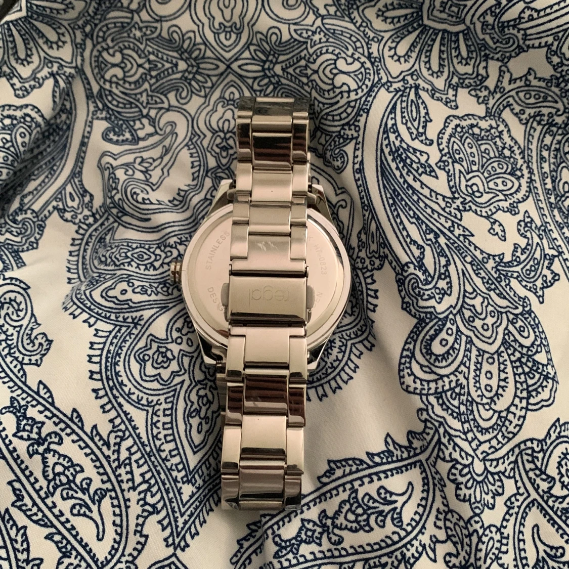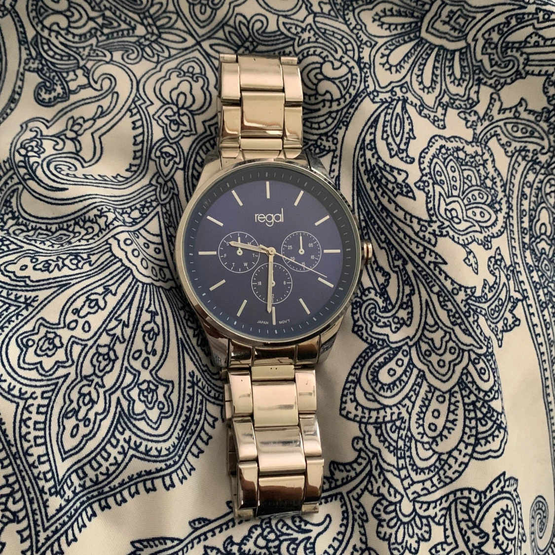 Stilren klocka från Regal med blå urtavla och tre mindre urtavlor. Armbandet är i blankt silverfärgat metall och har klassisk länkdesign. Klockan har tydliga vita markeringar och en modern, rund form som passar till många olika stilar. Säljer då jag ej använder den längre