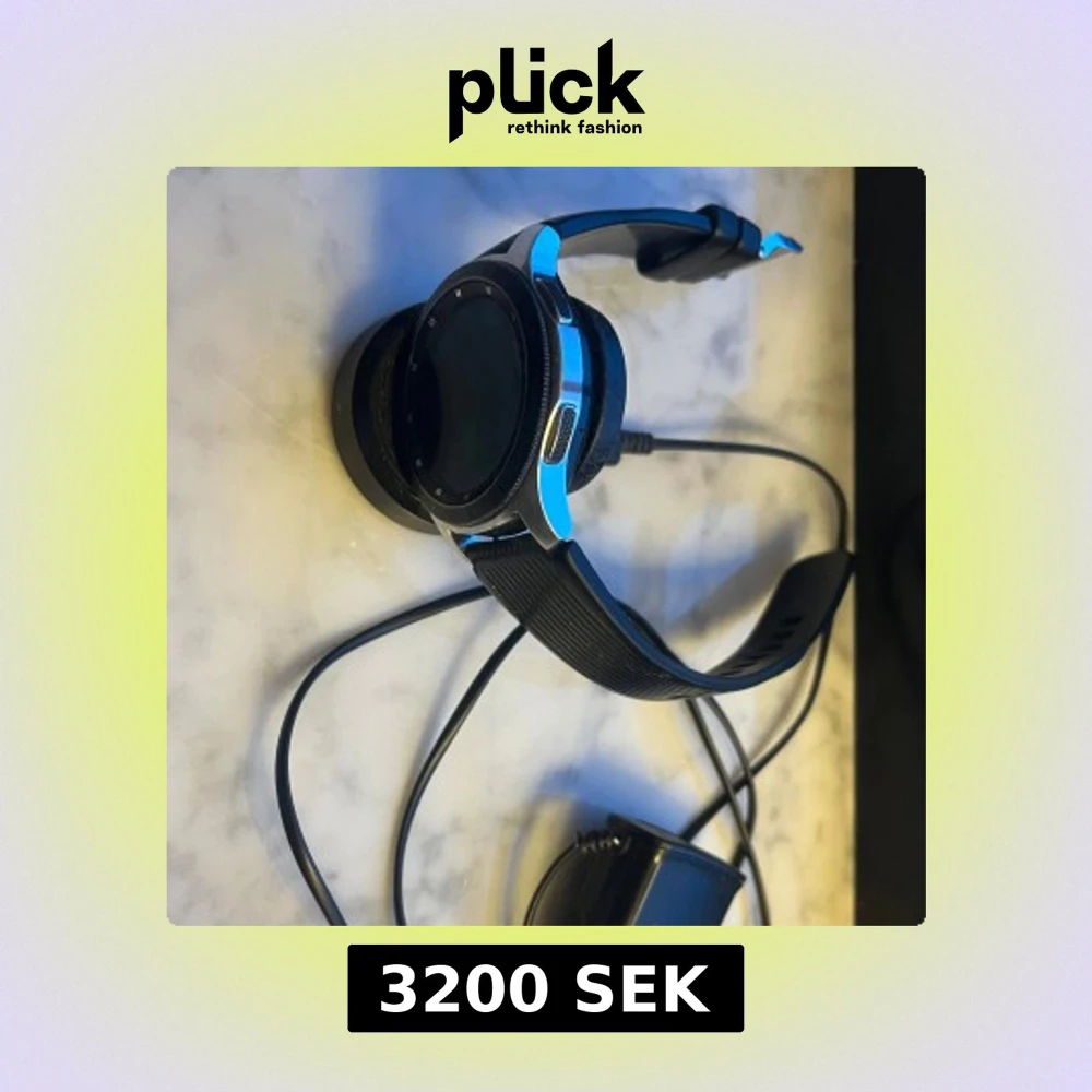 Säljer en Samsung Galaxy Watch med svart silikonarmband och silverfärgad boett. Klockan har rund urtavla och levereras med laddare. Perfekt för dig som vill ha koll på notiser och hälsa direkt på handleden.