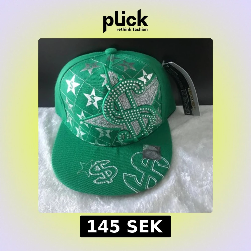 Snygg grön keps från Leader med glittriga stjärnor och ett stort dollartecken i strass. Kepsen har en rak skärm och är perfekt för att sticka ut i mängden. Tillverkad i polyester och har en justerbar passform. Helt ny