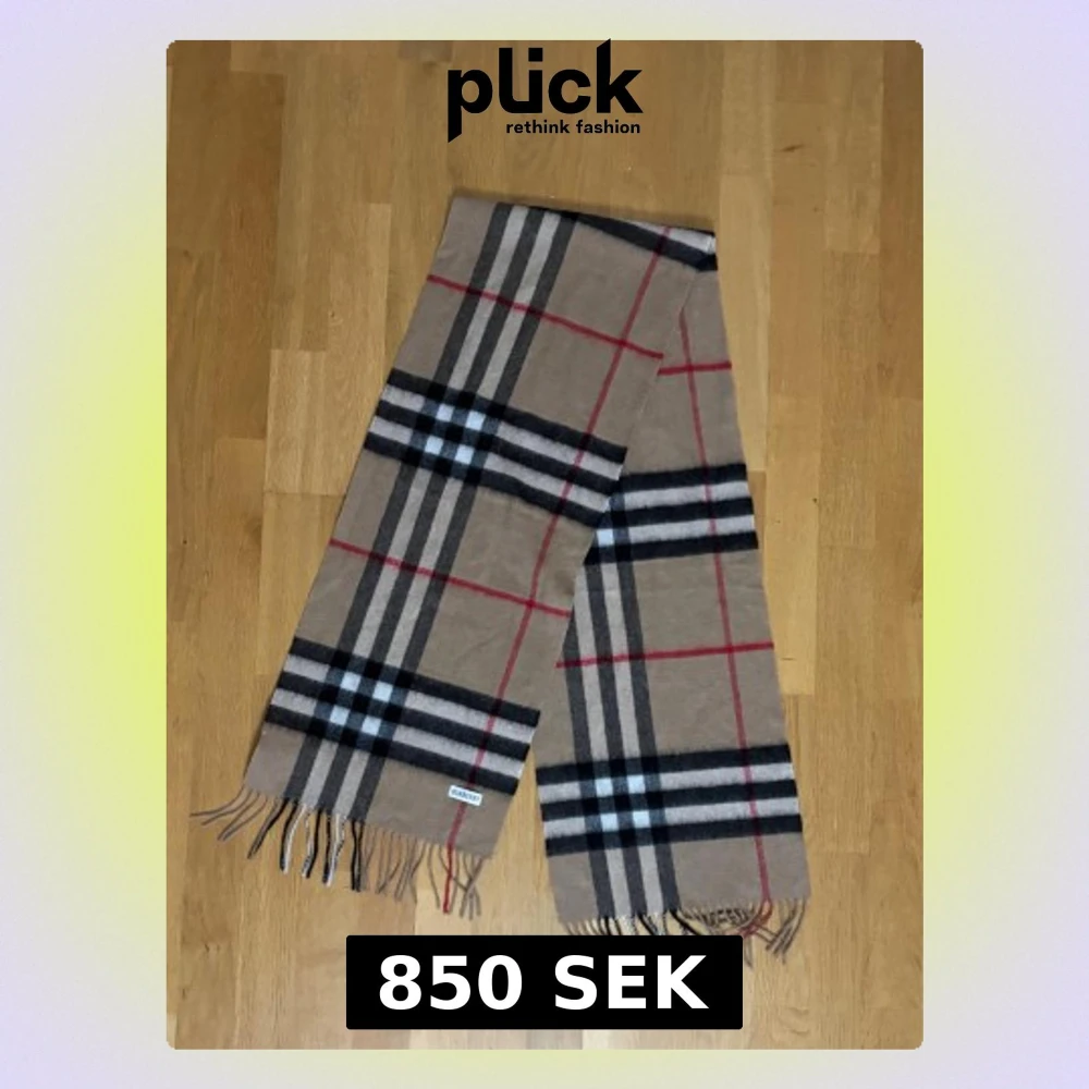 Säljer en klassisk beige halsduk från Burberry med det ikoniska rutiga mönstret i svart, vitt och rött. Halsduken har fransar i ändarna och är tillverkad i mjuk kashmir. Perfekt accessoar för att lyfta din outfit med lite lyxig känsla.