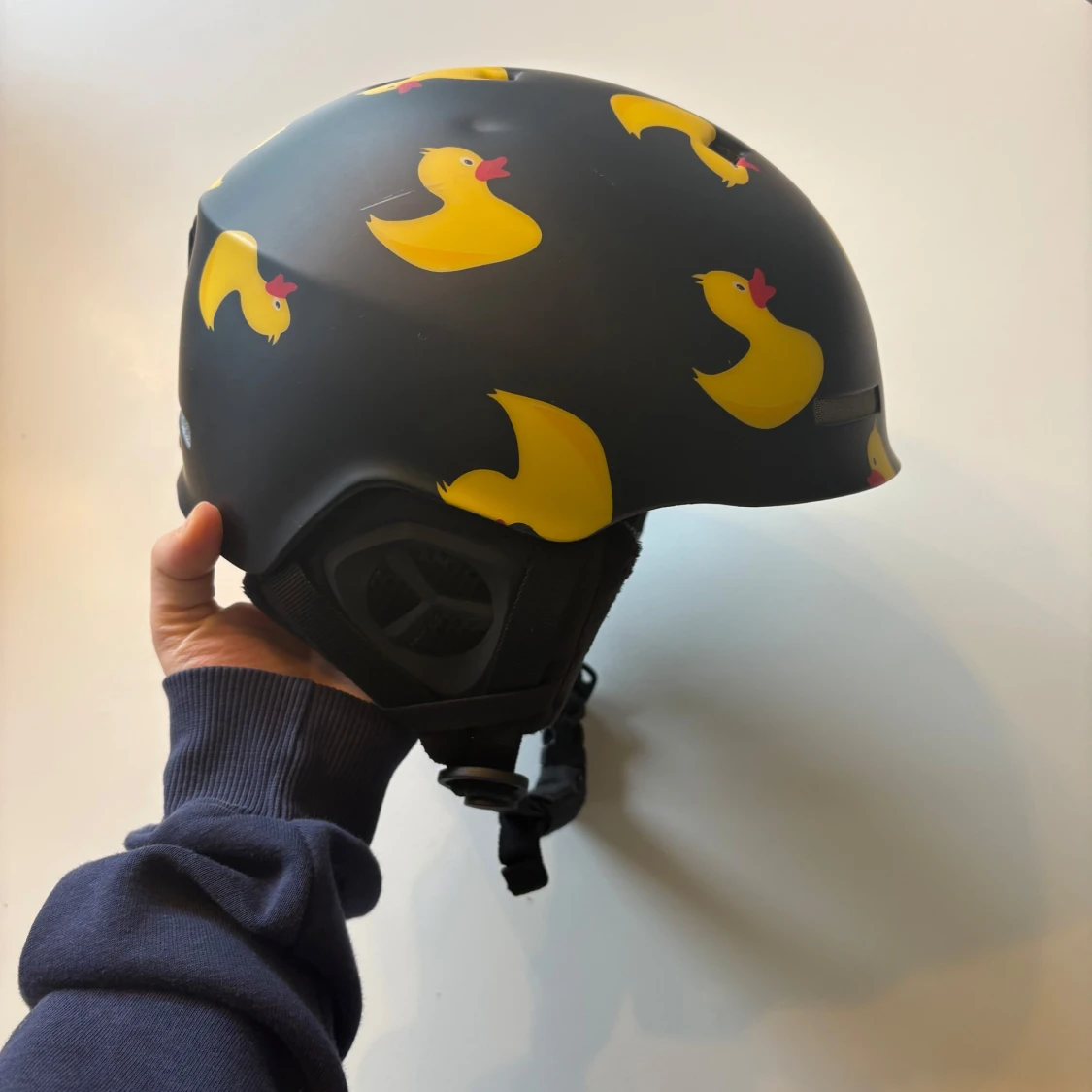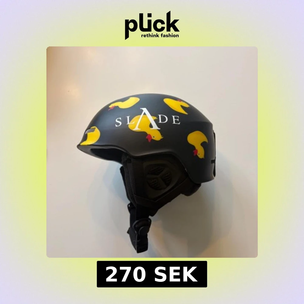 Cool svart hjälm från SLADE med unikt tryck av gula ankor och vit logga. Hjälmen har justerbart hakband och ventiler på sidorna. Du får buffen på köpet! Någon ynka repa på vänstra sidan men annars i gott skick! Jag säljer även en matchande skidjacka till om någon är intresserad 🥰