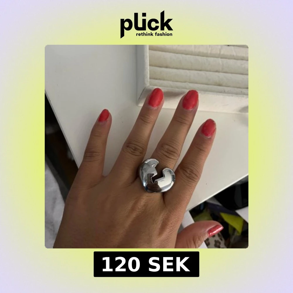 Säljer en chunky ring i silverfärgad metall med ett coolt brutet hjärta som motiv. Ringen har en blank, spegelblank yta och en unik form som verkligen sticker ut. Perfekt för dig som gillar statement-smycken och vill ha något annorlunda.