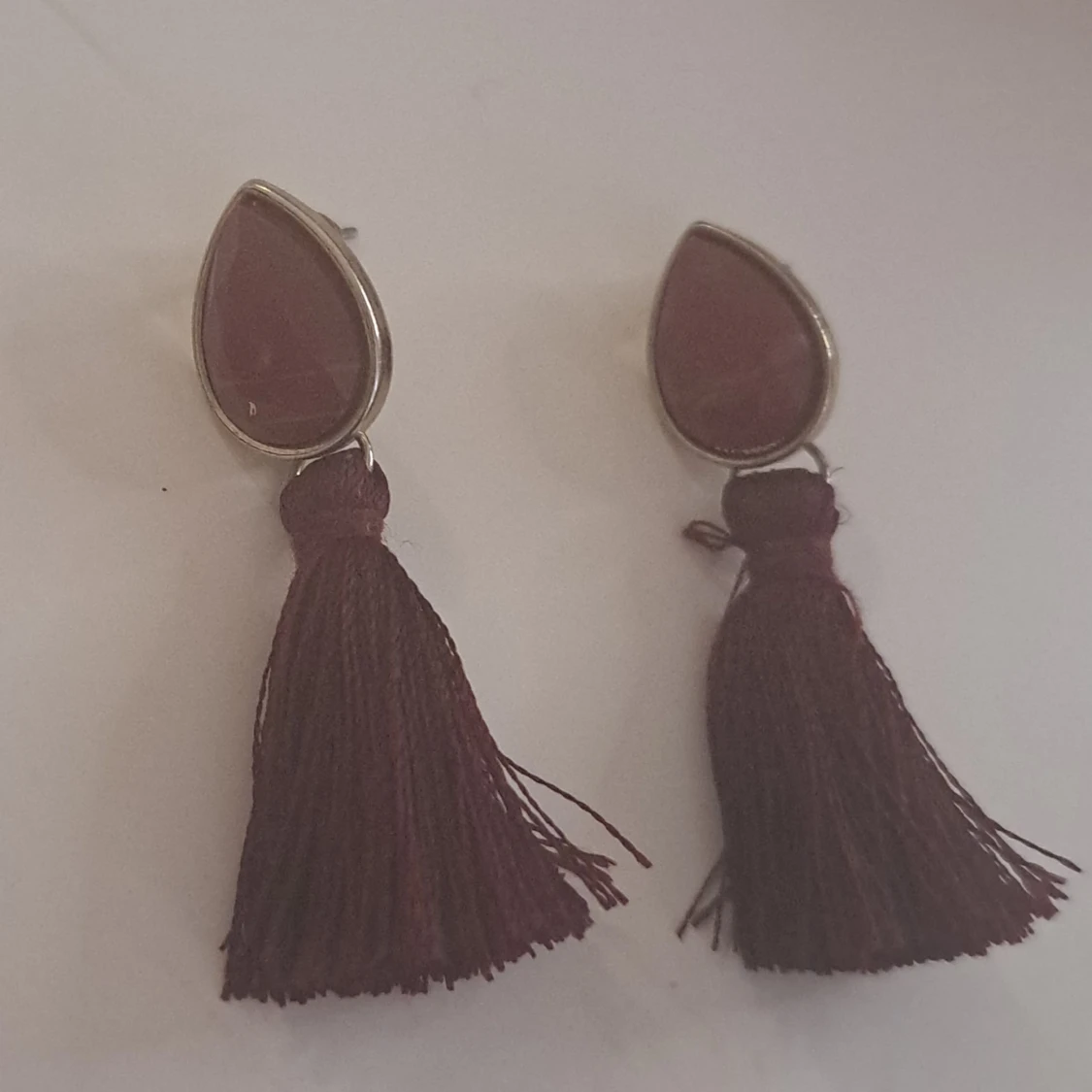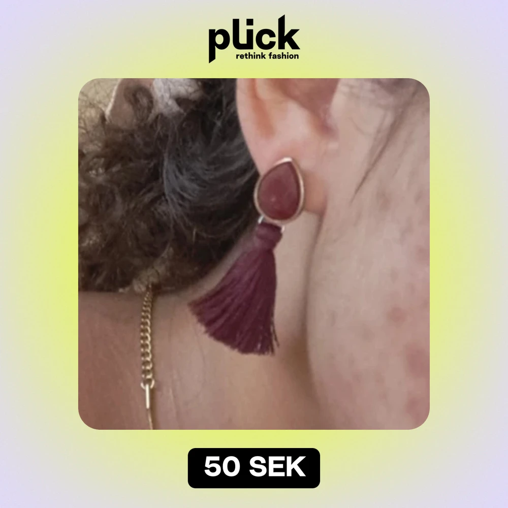 Ett par vinröda örhängen med droppformade stenar och tofsar. Örhängena har en metallram runt stenen och en hängande tofs i matchande färg.